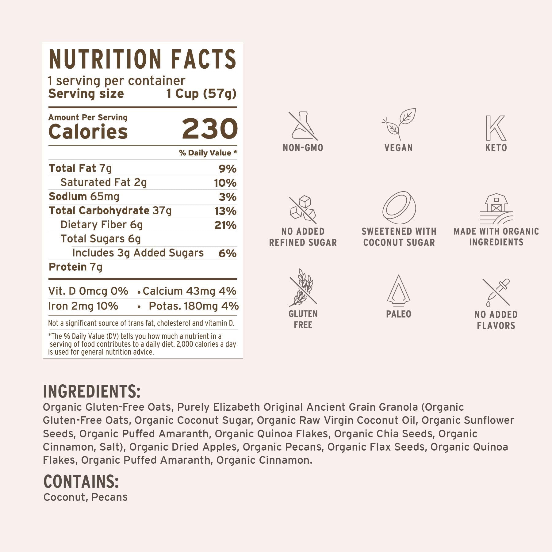 Q: What are the main ingredients in Purely Elizabeth Vegan Gluten-Free Superfood Oats Cup?A: The main ingredients include organic gluten-free oats, real organic dried apples, pecans, quinoa, amaranth, flax, and a dash of cinnamon, providing a nutrient-dense and flavorful breakfast option.