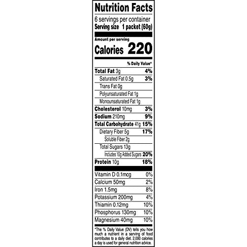 Q: What is the serving size and packaging of Quaker Instant Oatmeal?A: Quaker Instant Oatmeal, Protein Apple Cinnamon comes in a pack of 36 individual 2.11 oz packets, making it convenient for portion control and easy to take on-the-go.