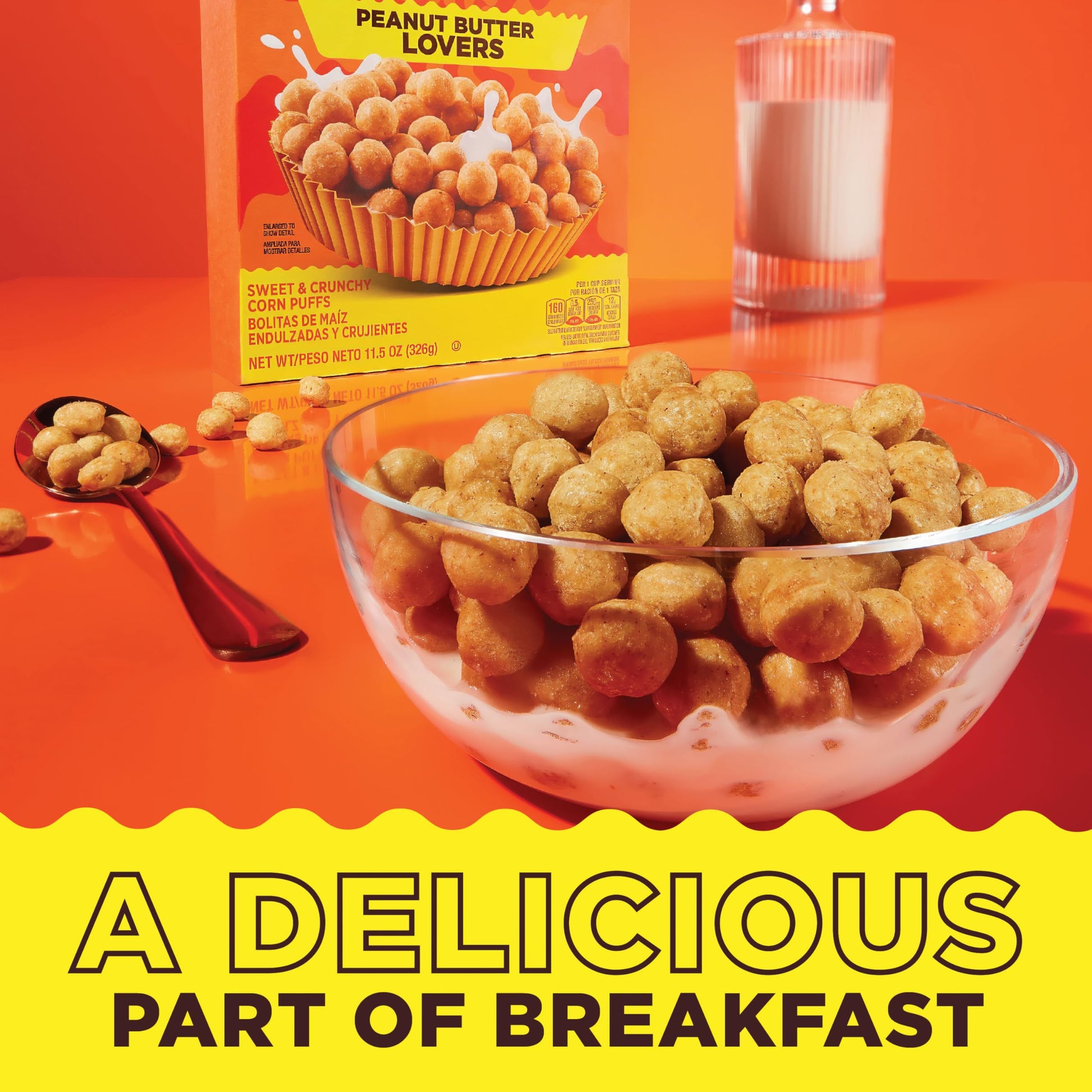 REESES PUFFS Peanut Butter Lovers Cereal is like a peanut butter high five to your taste buds! A tasty twist on the original REESES PUFFS, enjoy the full-on irresistible flavor of peanut butter without the chocolate. Made with real REESES Peanut Butter, a one-cup serving of cereal provides a good source of calcium, 15g of whole grain (at least 48g recommended daily), and 12 vitamins and minerals. Grab a crispy bowl of peanut butter cereal with milk as part of a quick and yummy breakfast. Add this puffed corn cereal to cereal bars for irresistible party snacks or team treats. Pack some in small bags for lunch box snacks. Sprinkle REESES PUFFS over your favorite desserts to add tasty peanut buttery crunch. Whether you enjoy this lip-smacking cereal as school snacks for kids, ingredients for cereal peanut butter bars, or a delight for the peanut butter lover in your life, General Mills cereals spread goodness from tots to grown-ups.