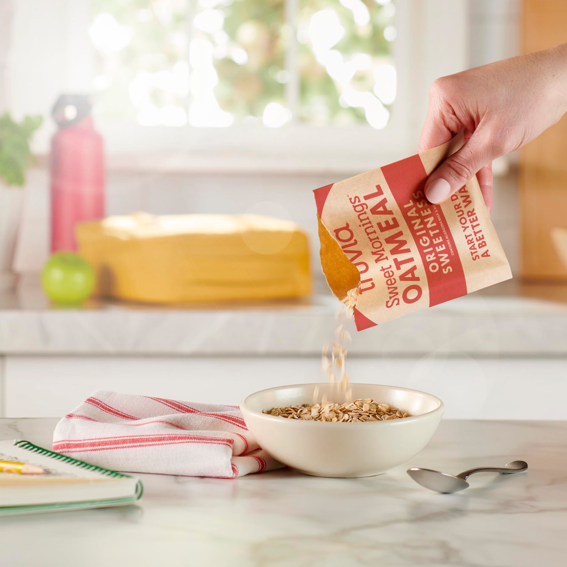 - Q: How do I prepare Truvia® Sweet Mornings™ Oatmeal? A: Preparing Truvia® Sweet Mornings™ Oatmeal is quick and easy. Simply add hot water or milk to the packet, stir, and let it sit for 2 minutes. This makes it a convenient option for busy mornings.