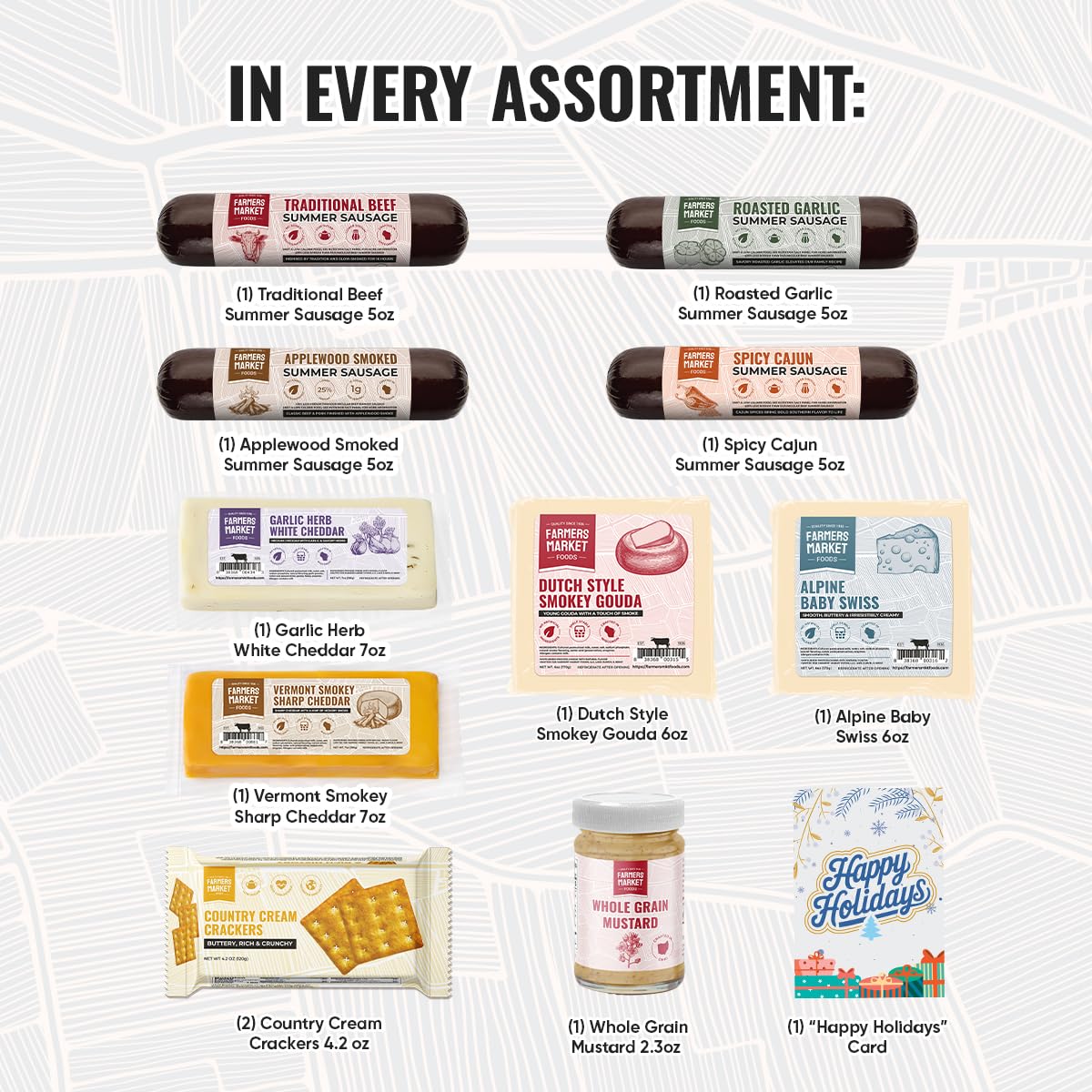 - Q: What types of sausages are included in the Farmers Market Gift Basket? A: The Farmers Market Gift Basket includes a variety of sausages such as Traditional Beef, Roasted Garlic, Spicy Cajun, and Applewood Smoked.