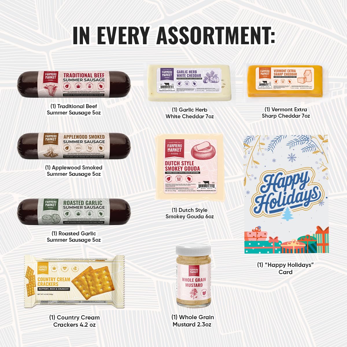 - Q: What types of sausages are included in the Farmers Market Gift Basket? A: The Farmers Market Gift Basket includes three varieties of summer sausages: Traditional Beef, Roasted Garlic, and Applewood Smoked, each weighing five ounces.