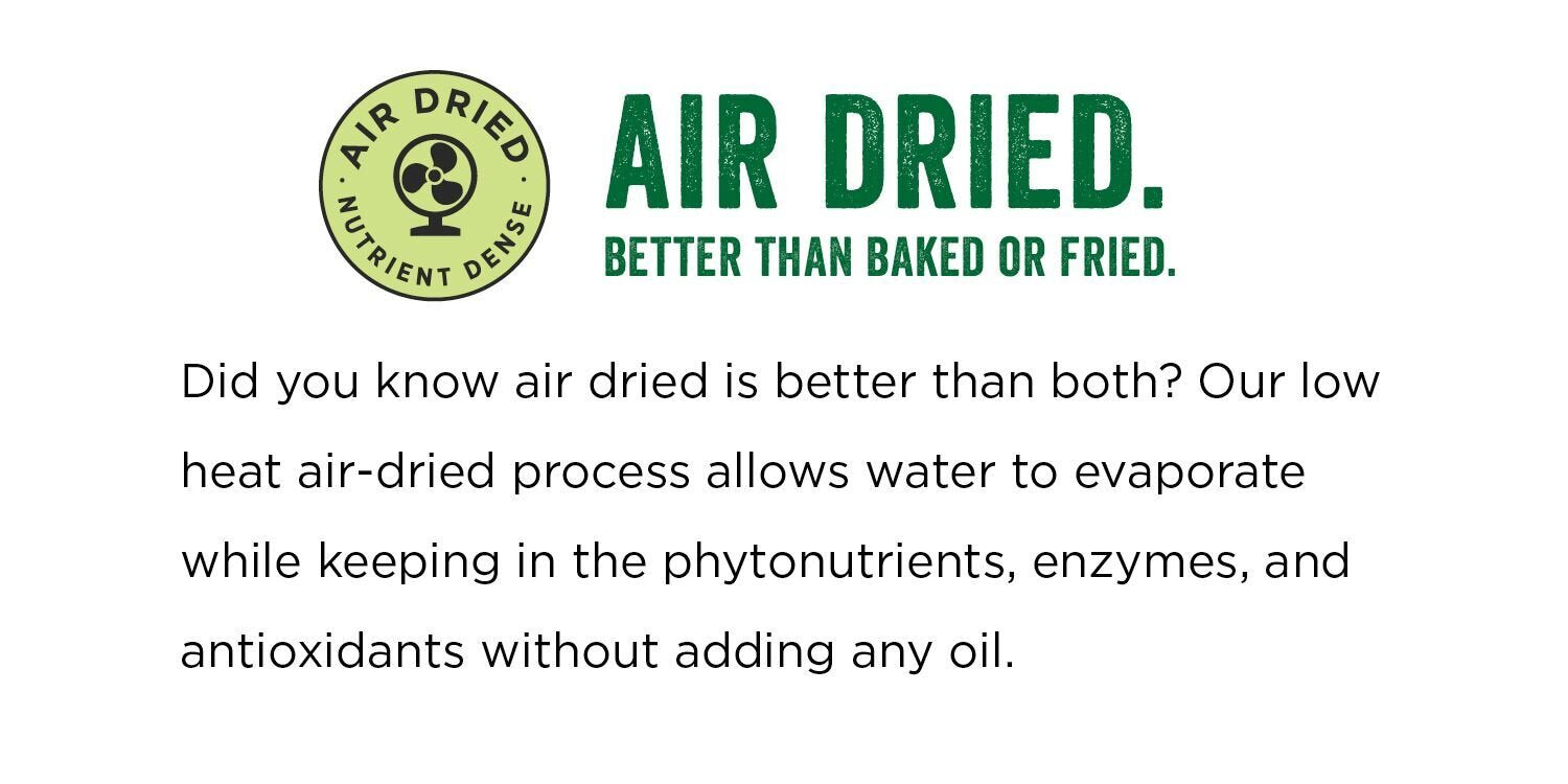 Q: How is Brad's Crunchy Kale prepared?A: The Crunchy Kale is prepared using an air-crisping technique that maintains the vitamins, nutrients, and enzymes of fresh produce, ensuring a healthy snack that is never baked or fried.