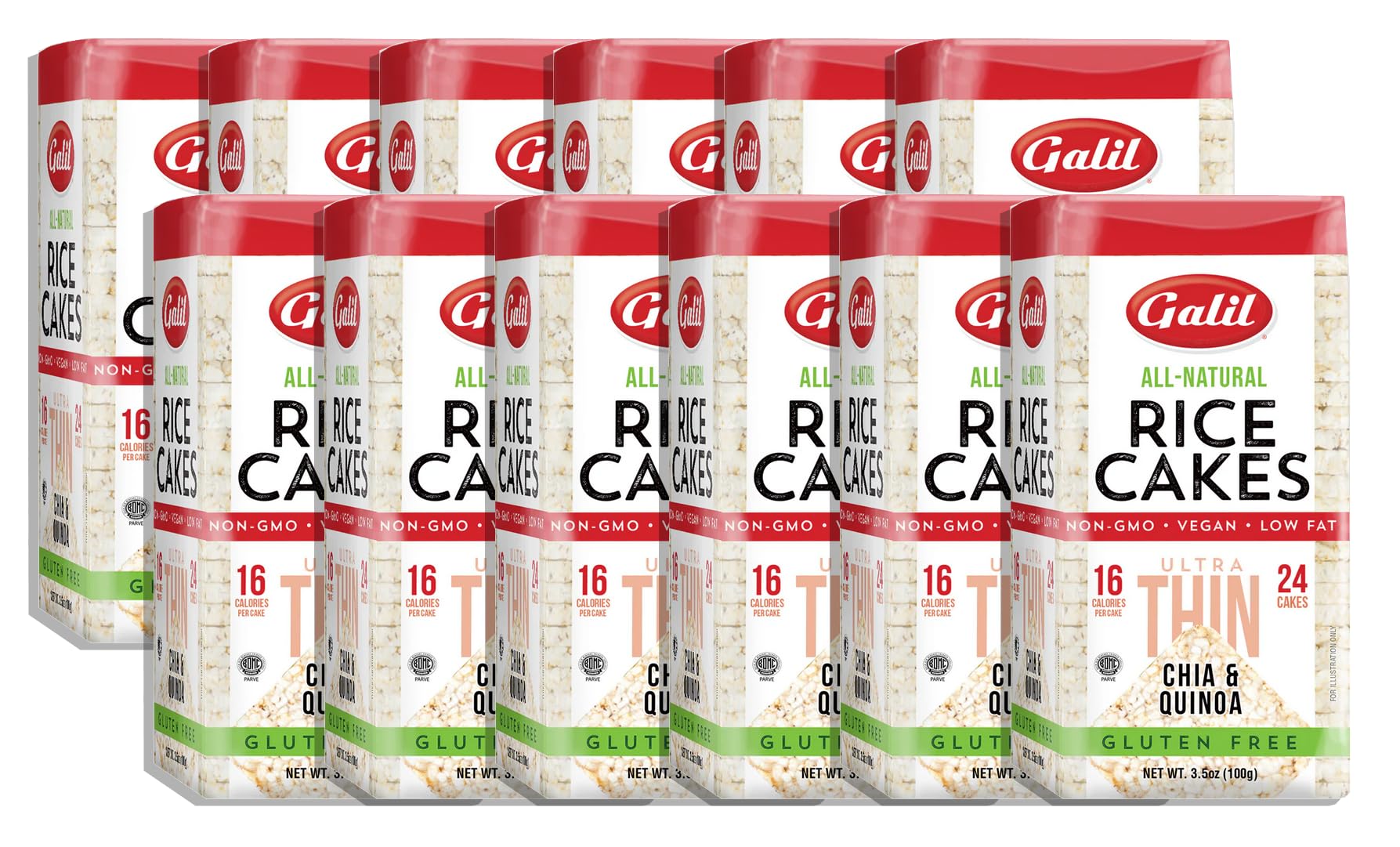 Q: How many rice cakes are included in a pack?A: Each pack of Galil Ultra-Thin Rice Cakes contains 24 cakes, and you will receive a total of 12 packs, providing ample supply for snacking and meal prep.
