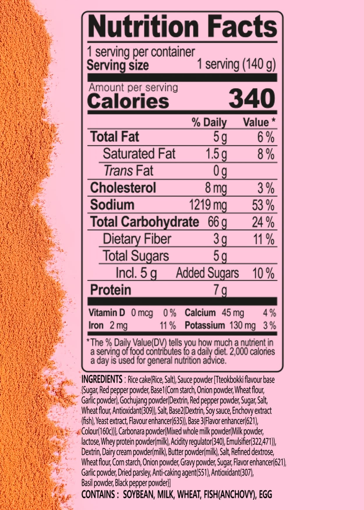 Q: What makes the Spicy Carbonara flavor unique?A: The Spicy Carbonara flavor combines a rich carbonara base with a spicy twist, providing a unique and delicious taste compared to traditional tteokbokki made with red pepper paste.