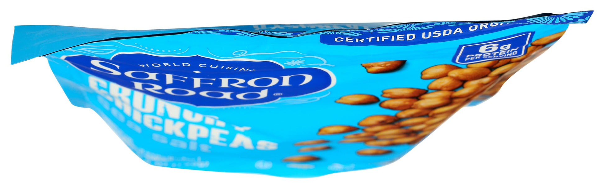 Q: What are the main ingredients in Saffron Road Organic Sea Salt Crunchy Chickpea Snack?A: The Saffron Road Organic Sea Salt Crunchy Chickpea Snack is made primarily from organic chickpeas, which are roasted to achieve a crunchy texture and seasoned with a blend of spices. It is USDA Organic certified and free from gluten and GMOs.