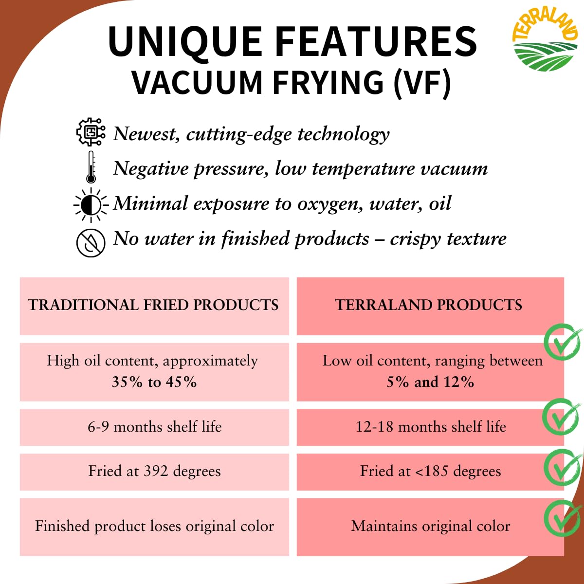 - Q: What makes Terraland Shiitake Chips different from regular potato chips? A: Terraland Shiitake Chips are distinct from regular potato chips due to their unique umami flavor derived from mushrooms, lower oil content achieved through vacuum frying, and their health benefits, including being low in calories and high in fiber.