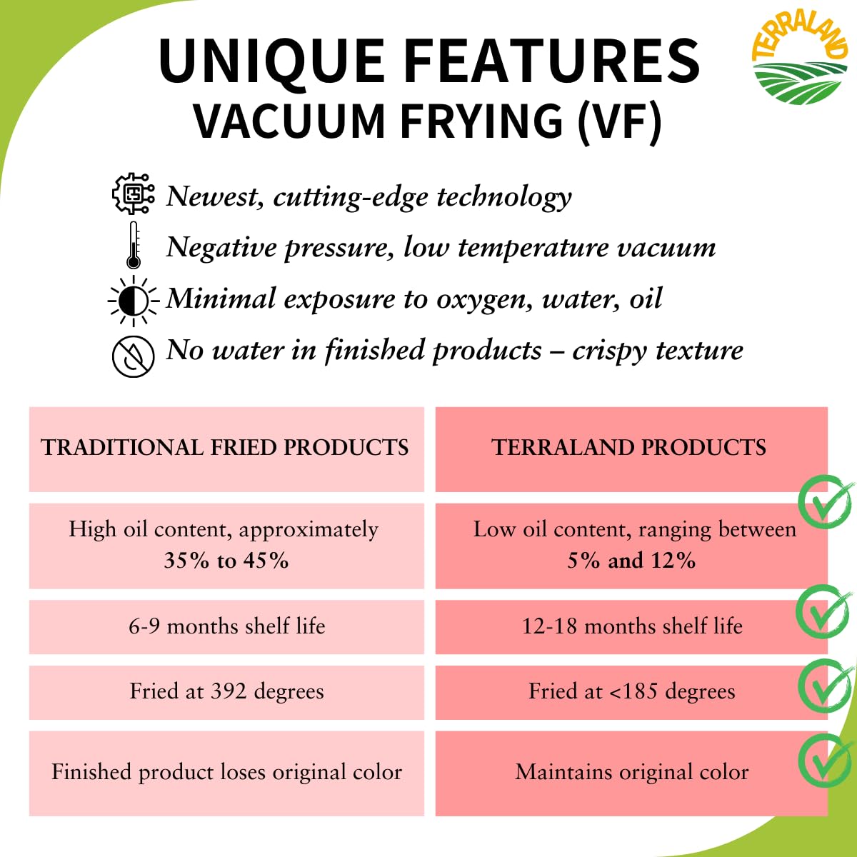 Terraland Believes In The Deep Connection Between People And Nature Through The Foods We Consume. We Are Passionate About Healthy, Tasty Foods That Enhance Our Original Ingredient Intake While Delighting Our Taste Buds With Every Crunch. Our Vacuum-Fried Vegetable And Fruit Snacks Are Made With Less Oil And Keep The Original Ingredient Value Compared To Traditionally Processed Snacks. This Innovative Technology Allows Us To Offer A Balanced Eating Experience, Combining Flavor And Convenience. Terraland Is Dedicated To Supporting Consumers Evolving Lifestyle That Values Vegan, Additive-Free, Low-Oil Products. With Cutting-Edge Vacuum Frying Technology, Our Products Effectively Preserve The Ingredients' Flavors, Color, And Texture By Processing At Low Oil Temperatures And Pressure While Minimizing Exposure To Oxygen, Water, And Oil.