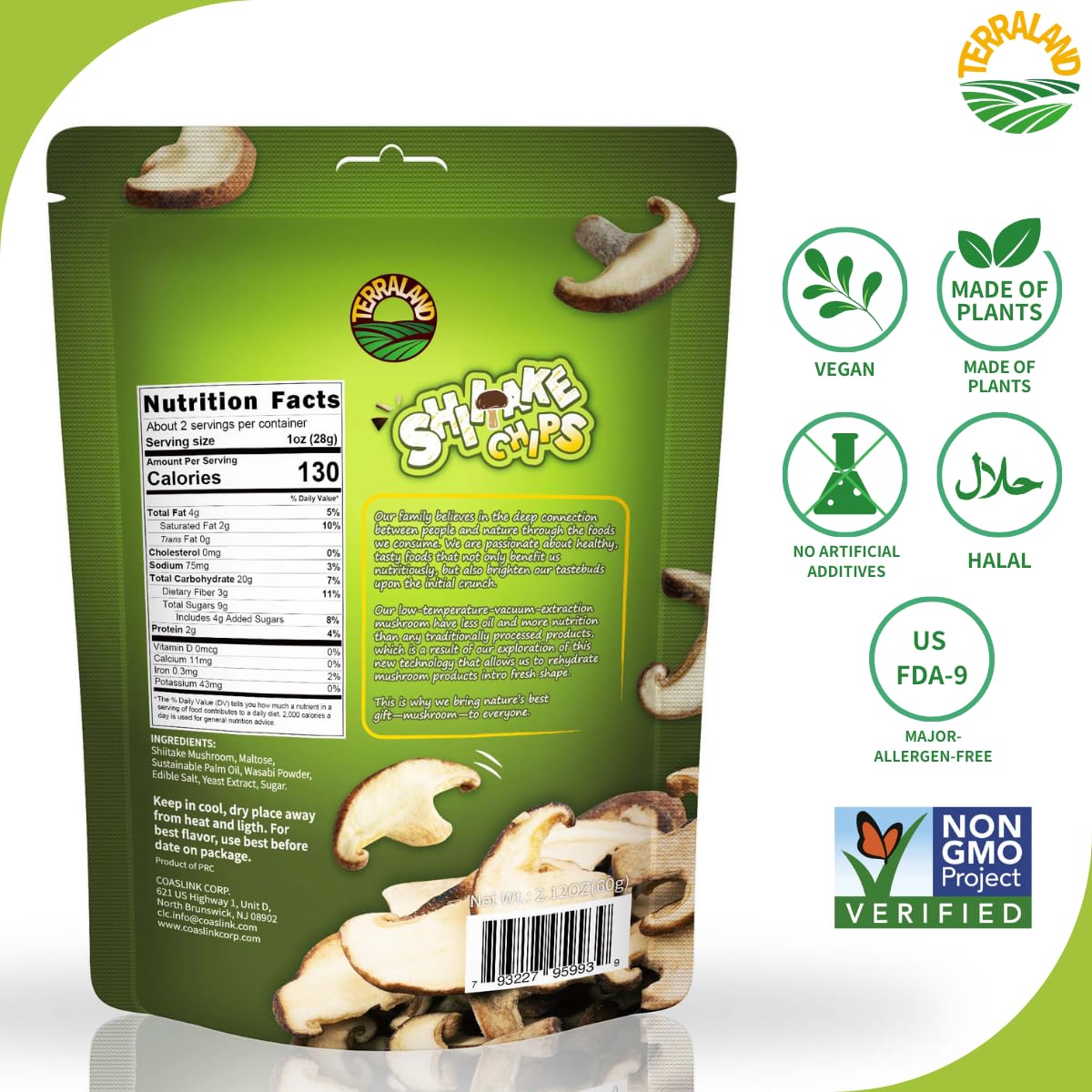 Q: What are Terraland Shiitake Chips made from?A: Terraland Shiitake Chips are made primarily from natural mushrooms, utilizing advanced vacuum frying technology to retain their nutritional value while minimizing oil content.