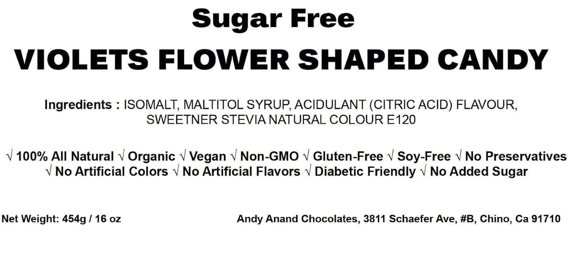 - Q: What are the main ingredients in Andy Anand Sugar Free Candy Violets? A: The main ingredients in Andy Anand Sugar Free Candy Violets include stevia as a sweetener, which is derived from natural sources, along with flavorings that give the candy its delightful essence of violet. It is a sugar-free hard candy, making it suitable for those looking to reduce their sugar intake.