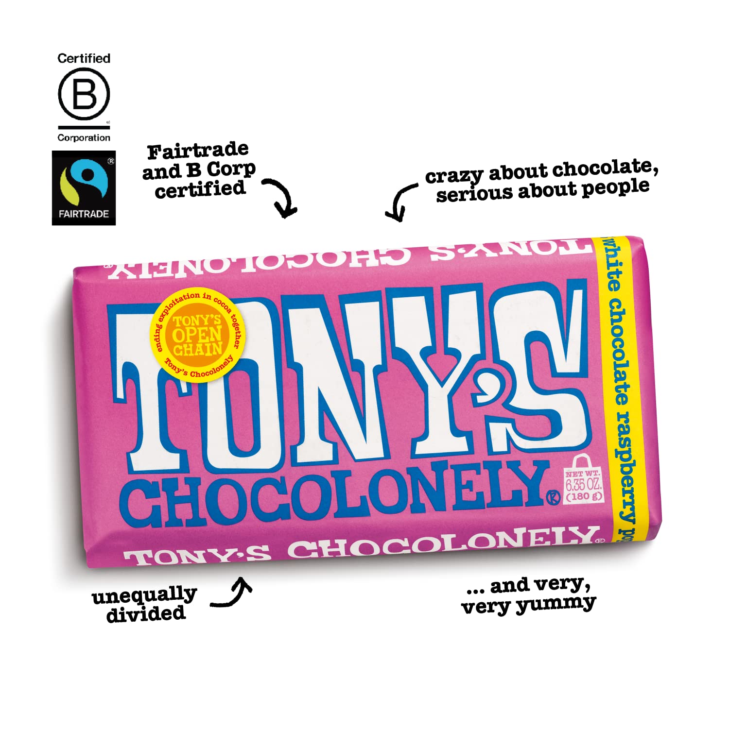 Break out your disco balls because Tonys White Chocolate Bar with Raspberry Popping Candy is here to get the party started! Weve mixed creamy, dreamy white chocolate with tangy raspberry and added a little surprise with popping candy to make this bar really pop! Every bite is an explosion of flavor and fun thatll have your taste buds dancing. Sweet, creamy, and with just the right amount of fizz, this bar is as playful as it is delicious. At Tonys, we believe that chocolate should do more than just taste amazing-it should make a difference. Thats why our White Chocolate Bar with Raspberry Popping Candy is made with Fairtrade traceable cocoa sourced from farms in West Africa. By choosing Tonys, youre not just enjoying a tasty dessert-youre supporting a movement that champions sustainability, transparency, and fair wages for farmers. We work directly with cocoa cooperatives to support our farmers to earn a living income and work in safe, fair conditions. The White Chocolate Bar with Raspberry Popping Candy is the perfect example of how Tonys combines exceptional flavor with a meaningful mission. From the first bite, youll experience the rich creaminess of the white chocolate, followed by the sweet burst of raspberry and the exciting popping candy for an unforgettable taste experience. Its the ultimate delight for anyone who loves something a little sweet, a little tangy, and a whole lot of fun. Whether youre indulging yourself, sharing with friends, or looking for the perfect gift, the White Chocolate Bar with Raspberry Popping Candy is sure to satisfy every craving. Its the perfect balance of creamy white chocolate and fruity raspberry with a playful pop of candy in every bite. Plus, with every purchase, youre helping create a more sustainable, ethical, and fair chocolate industry. So go ahead-enjoy a bar thats as exciting as it is flavorful, and feel good knowing youre supporting a brand thats working to change the cocoa industry for the better.