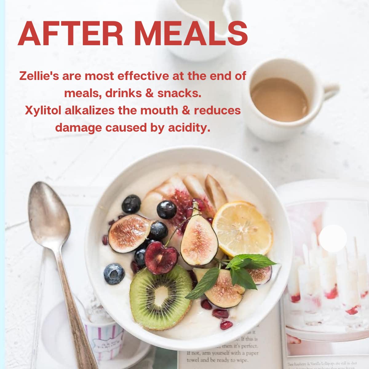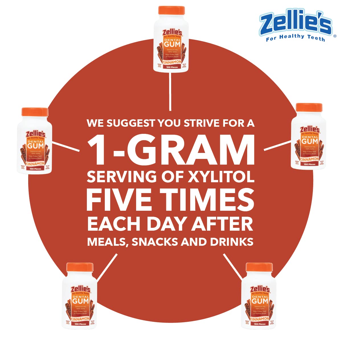 • Q: How often should I chew Zellie's gum for optimal dental benefits? A: For maximum dental benefits, it is recommended to chew Zellie's gum 6-10 grams of xylitol per day, ideally in 3-5 exposures. This can be achieved by enjoying a piece of gum after each meal, snack, or beverage.