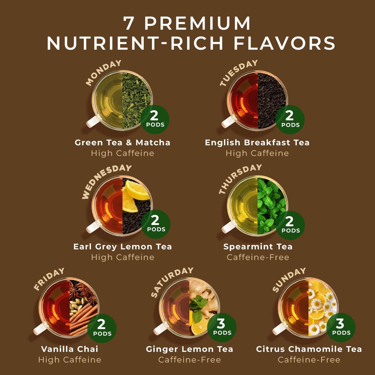 - Q: What flavors are included in the Gya Tea Co 7 Days Tea Pod Collection? A: The Gya Tea Co 7 Days Tea Pod Collection includes a variety of flavors: English Breakfast Tea, Matcha & Green Tea, Earl Grey Lemon Tea, Spearmint Tea, Vanilla Chai Tea, Ginger Lemon Tea, and Citrus Chamomile Tea.