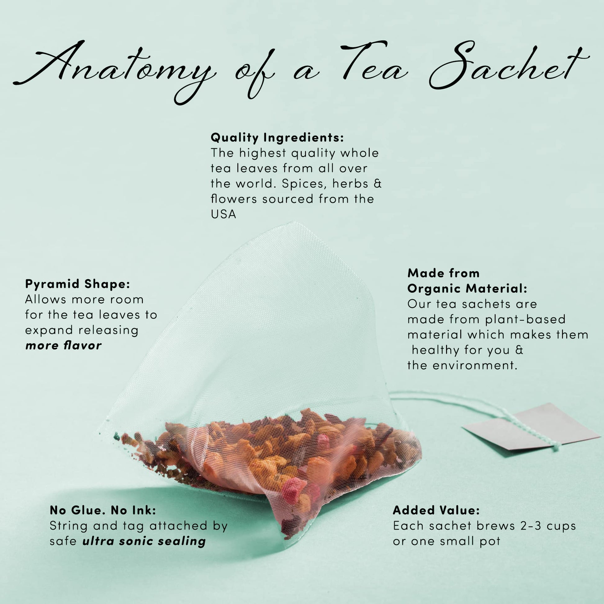 - All Natural: The tea sachets are made with plant-based materials, free from plastic, chemicals, ink, or glue.