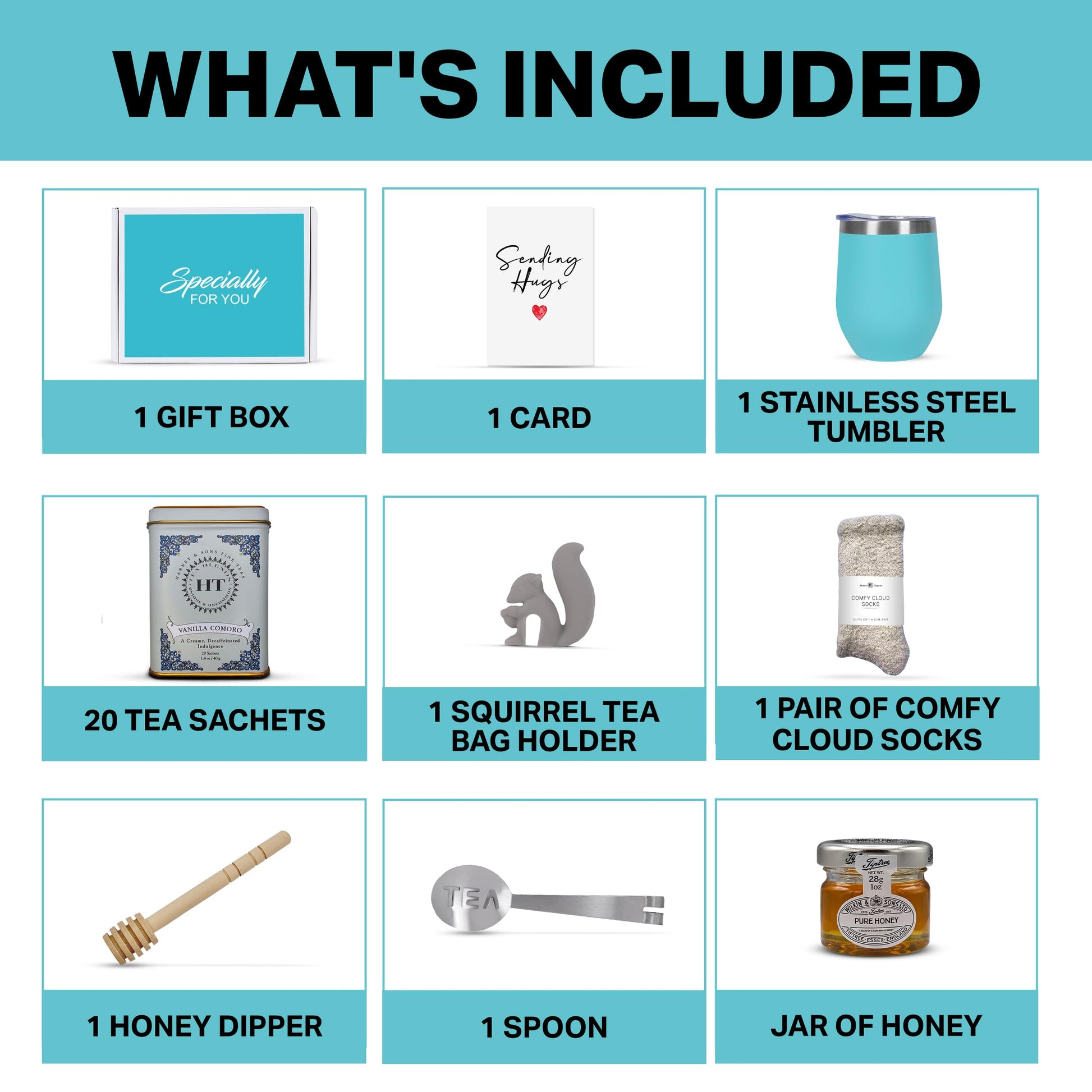 - Q: What items are included in the Tea Gift Set for Women? A: The Tea Gift Set includes cozy socks, a stainless steel tumbler, twenty tea sachets, a honey jar, and a 'Sending Hugs' card.