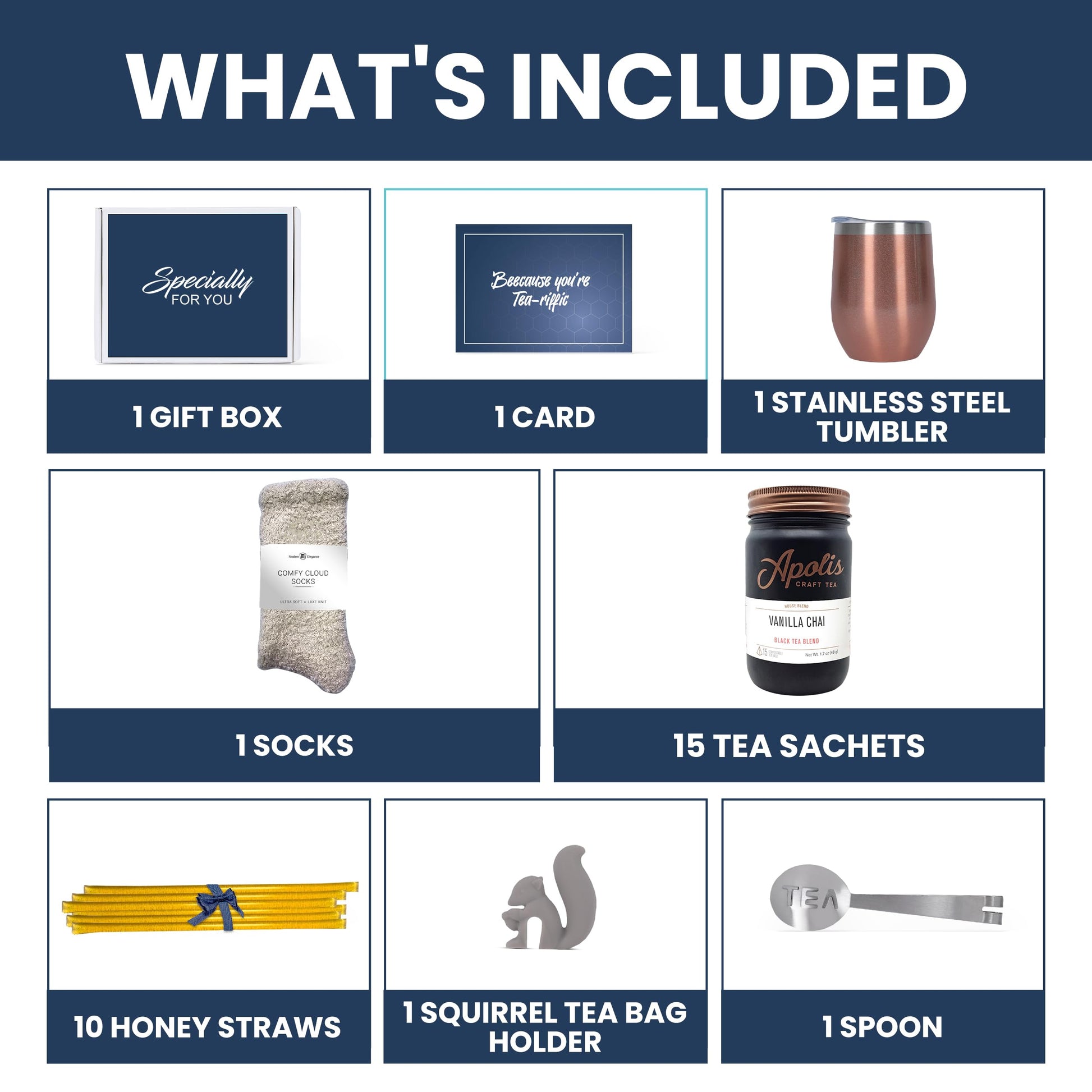 - Q: What items are included in the Tea Gift Set? A: The Tea Gift Set includes 15 craft tea sachets, a 12-ounce stainless steel tumbler, 10 honey straws, cozy socks, a silicone tea bag holder, a strainer spoon, and a greeting card.
