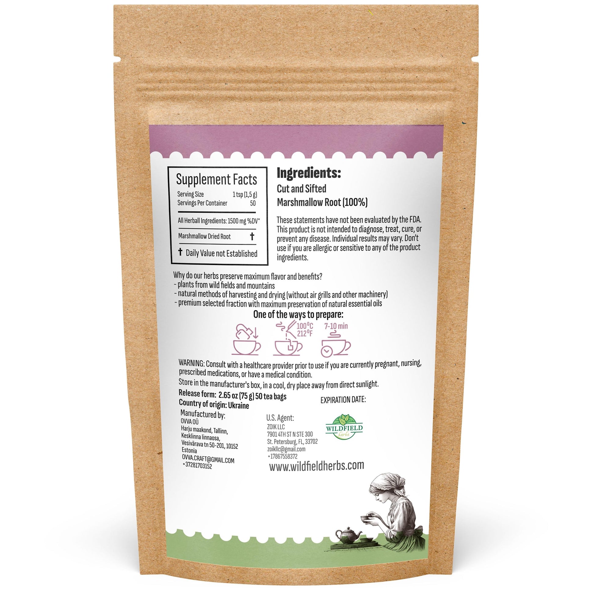 - Q: Are there any allergens in this Marshmallow Root Tea? A: Our Marshmallow Root Tea is made from 100% Althaea officinalis and does not contain any known allergens. However, if you have specific allergies or sensitivities, it's best to consult with a healthcare professional before consumption.