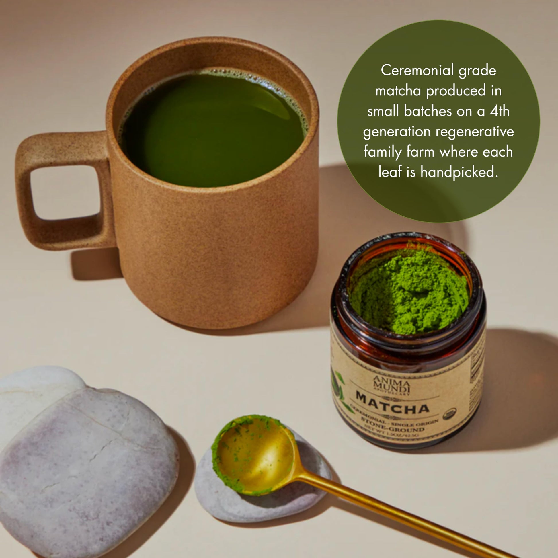 Q: What is the origin of Anima Mundi Apothecary Matcha Powder?A: Anima Mundi Apothecary Matcha Powder is sourced from a 4th generation family farm in Japan, known for its commitment to organic farming practices and sustainable cultivation methods.
