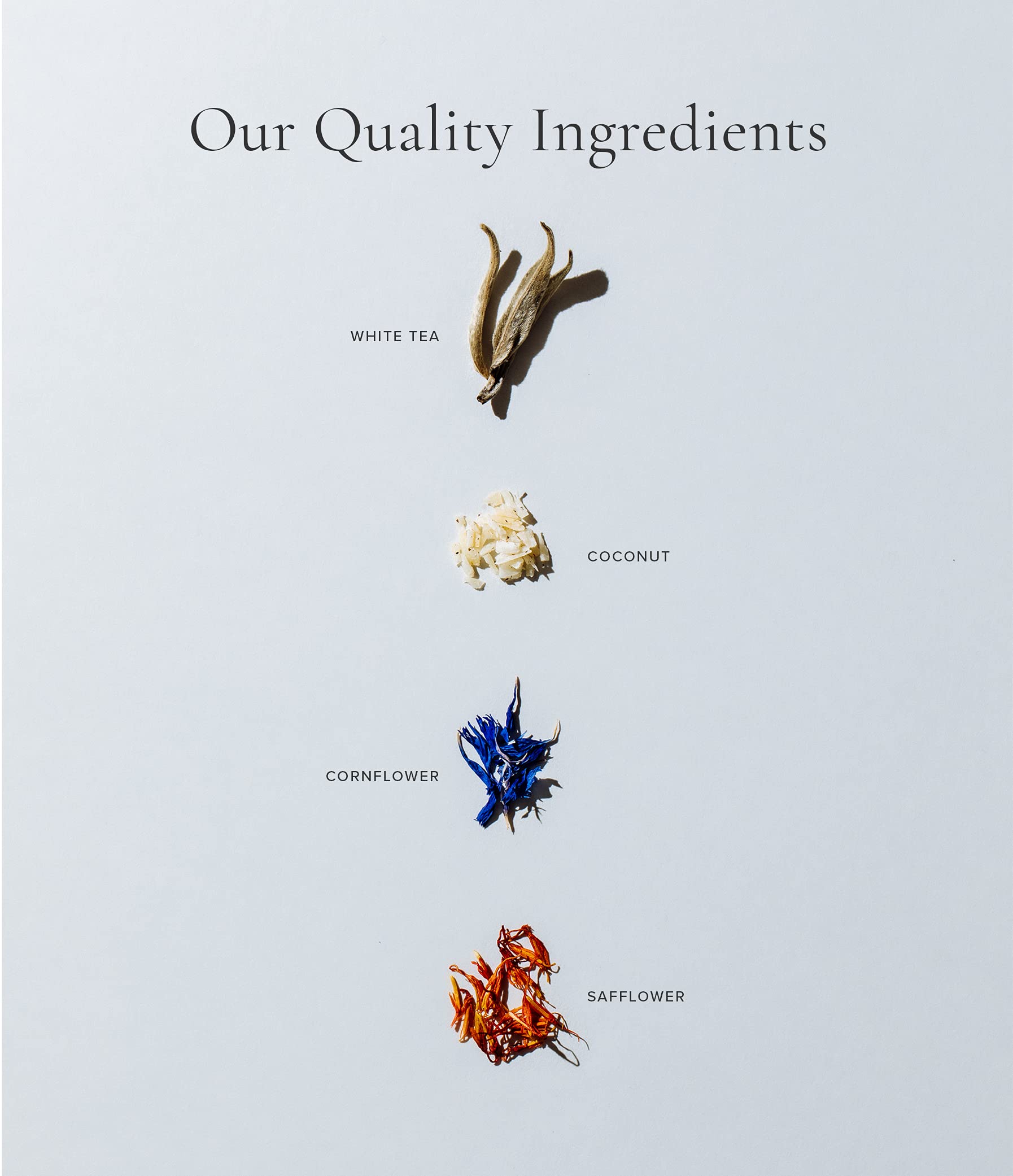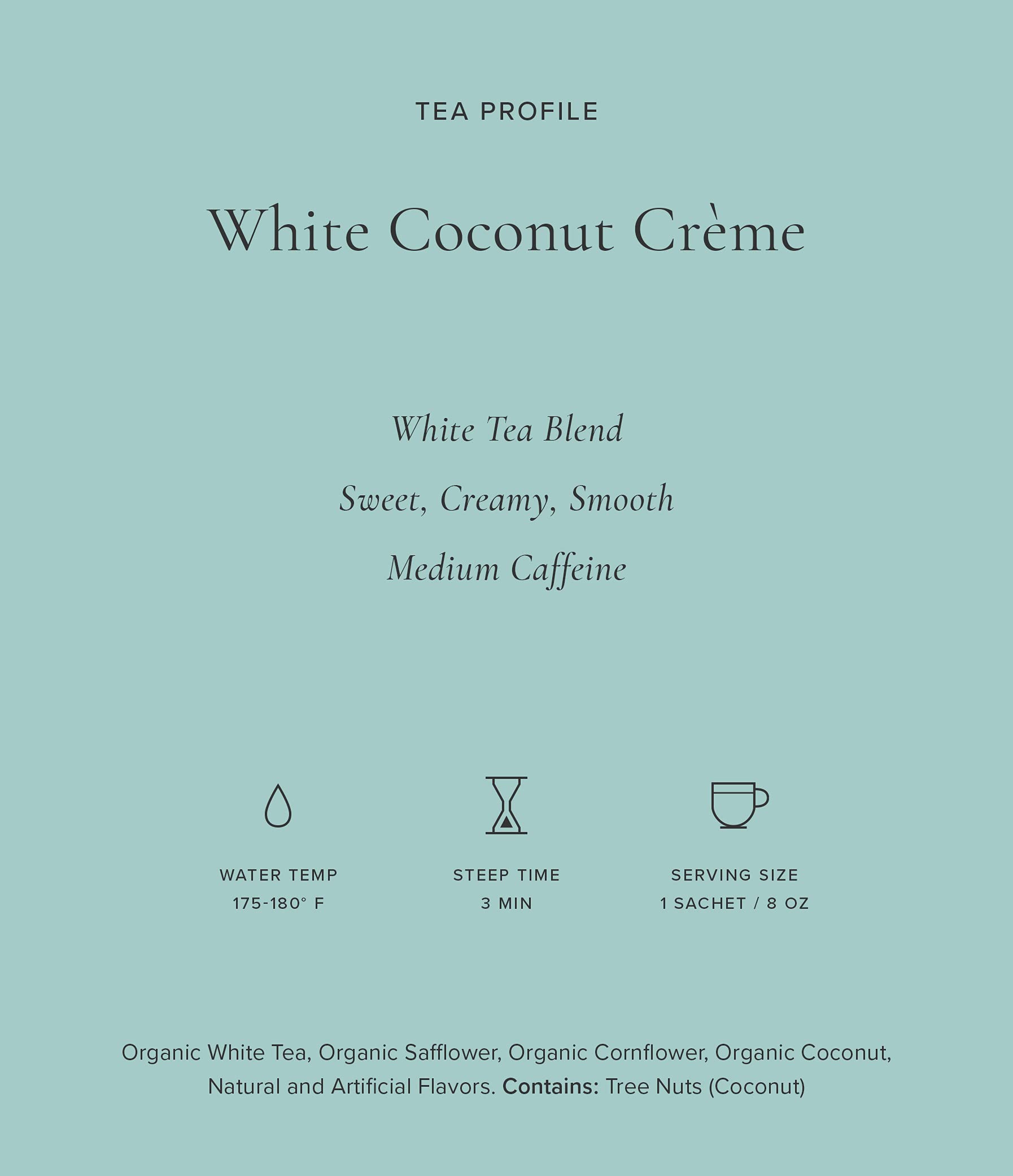 Q: What ingredients are in the Organic White Coconut Crème tea?A: The Organic White Coconut Crème tea is made from organic ingredients, including Organic White Tea, Organic Safflower, Cornflowers, Organic Coconut, and Natural and Artificial Flavors. It is free from additives.