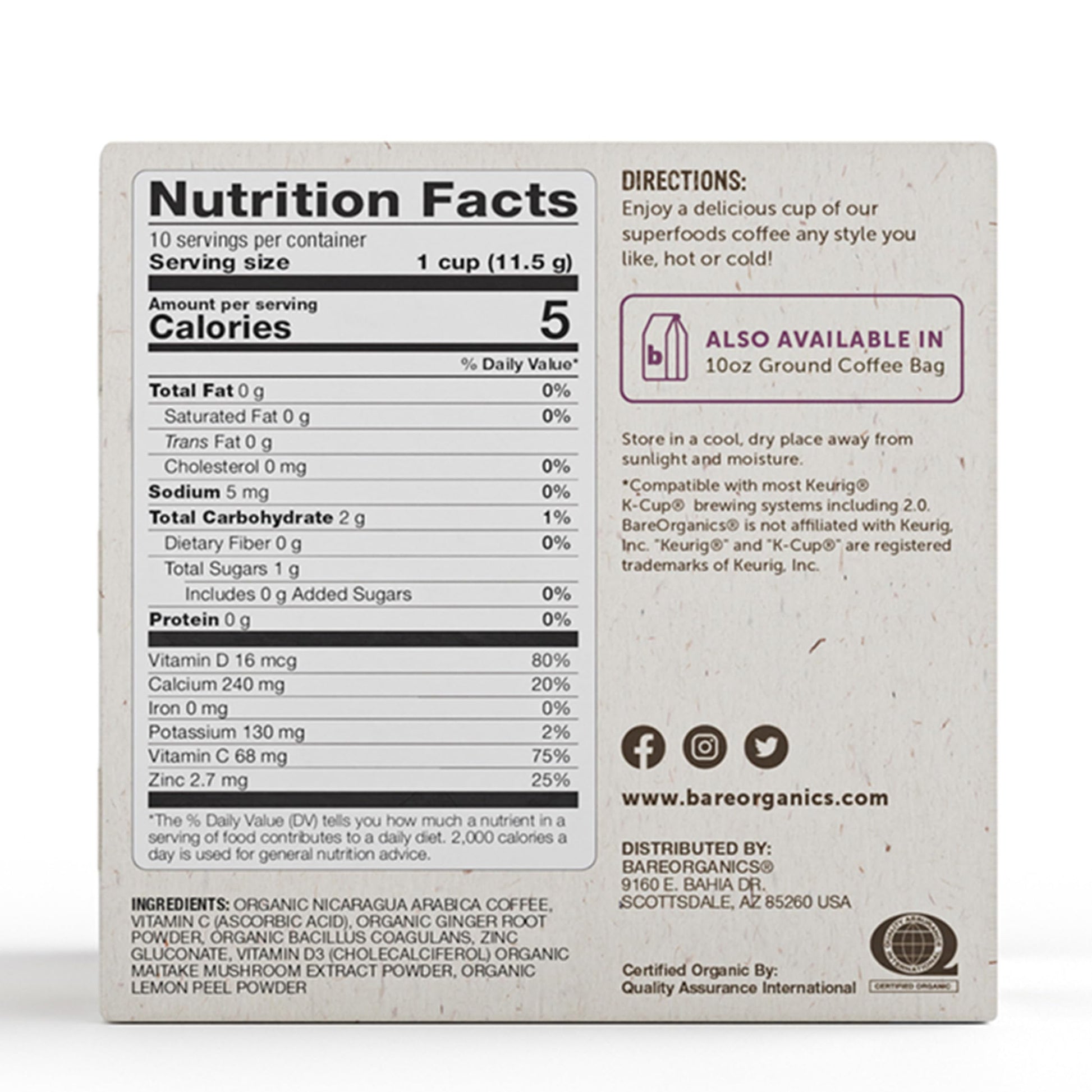 Q: What are the key ingredients in BareOrganics Daily Defense Coffee?A: BareOrganics Daily Defense Coffee is made with organic Arabica coffee beans and includes superfoods like ginger root, zinc, maitake mushrooms, lemon peel, as well as vitamins C and D, and probiotics for enhanced immune support.