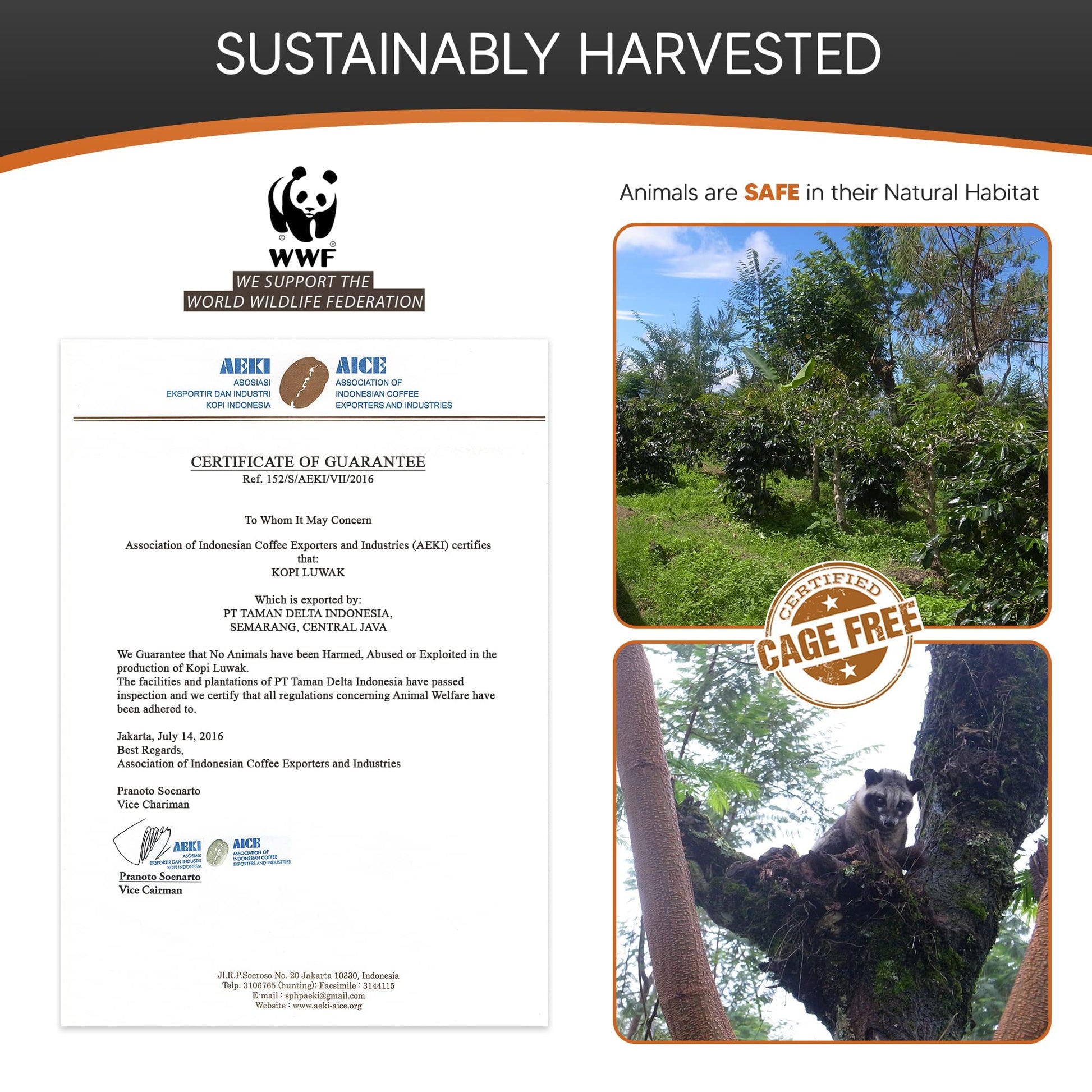 - Q: Is Kopi Luwak coffee ethically sourced? A: Yes, Cafés Granell coffee is ethically sourced. The beans come from free-range wild Luwaks in Indonesia, ensuring that no animals are harmed or exploited in the production process. The coffee is harvested sustainably, allowing the civets to roam freely and select the best berries.