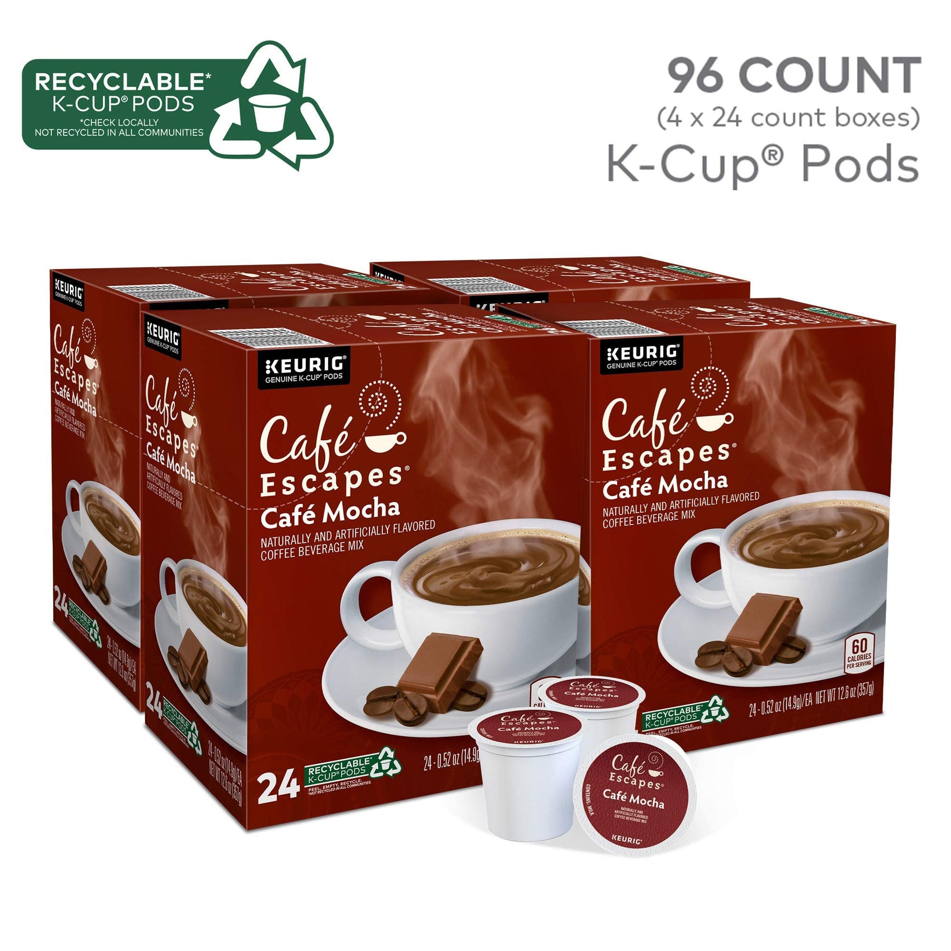 Descriptionevery Day, You Should Do Something Nice For Yourself. Take A Break. Relax. Recharge. Give In To A Few Delicious Moments Of Me Time. Caf Escapes Salutes This Notion With A Delectable Collection Of Indulgent Treats. Take Yourself Beyond Coffee. Reward Yourself With A Rich, Indulgent Caf Escapes Beverage That Takes You Beyond Coffee. When Cocoa And Coffee Get Together, Delicious Things Happen. Delectably Sweet And Surprisingly Delicate, Our Caf Escapes Cafe Mocha Is A Sophisticated Treat That'Ll Make Your ''Me Time'' More Amazing. Each Delicious Variety Is Under 8 Calories, So Give In And Savor A Few Moments. Compatible With Keurig K-Cup Pod Single-Serve Coffee Makers. Introducing Recyclable* K-Cup Pods: Simple. Delicious. And Now Recyclable. Enjoy The Same Great-Tasting Coffee You Know And Love, And When Youre Done Just Peel, Empty And Recycle. *Check Locally, Not Recycled In All Communities. Packaging May Vary.