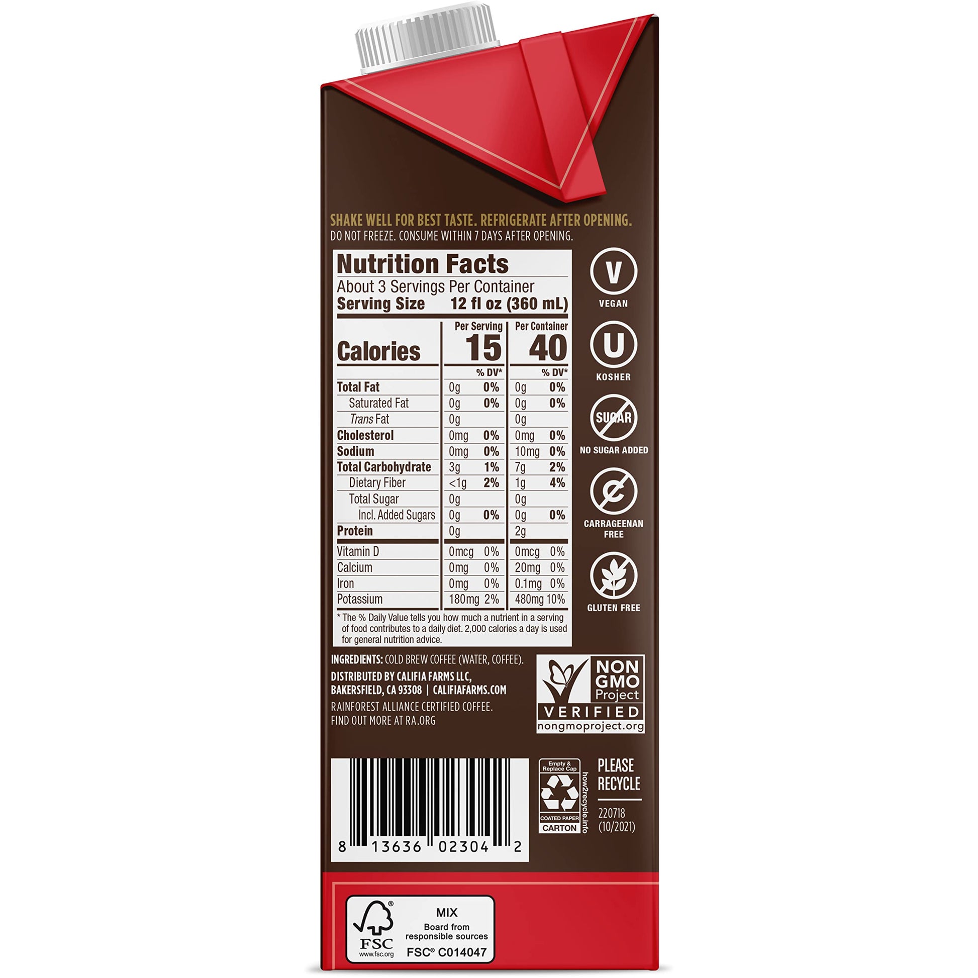 Q: What makes Califia Farms Unsweetened Cold Brew Coffee ethical?A: Califia Farms Unsweetened Cold Brew Coffee is Rainforest Alliance Certified, which means it is produced in a way that supports sustainable farming practices and environmental responsibility.