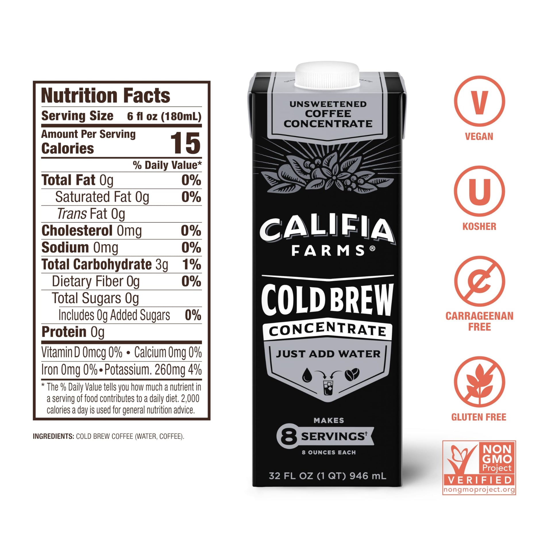 Q: Is Califia Farms Cold Brew Coffee vegan and gluten-free?A: Yes, Califia Farms Unsweetened Cold Brew Coffee Concentrate is vegan, gluten-free, and free from allergens such as nuts, soy, and dairy. It is also non-GMO and kosher.