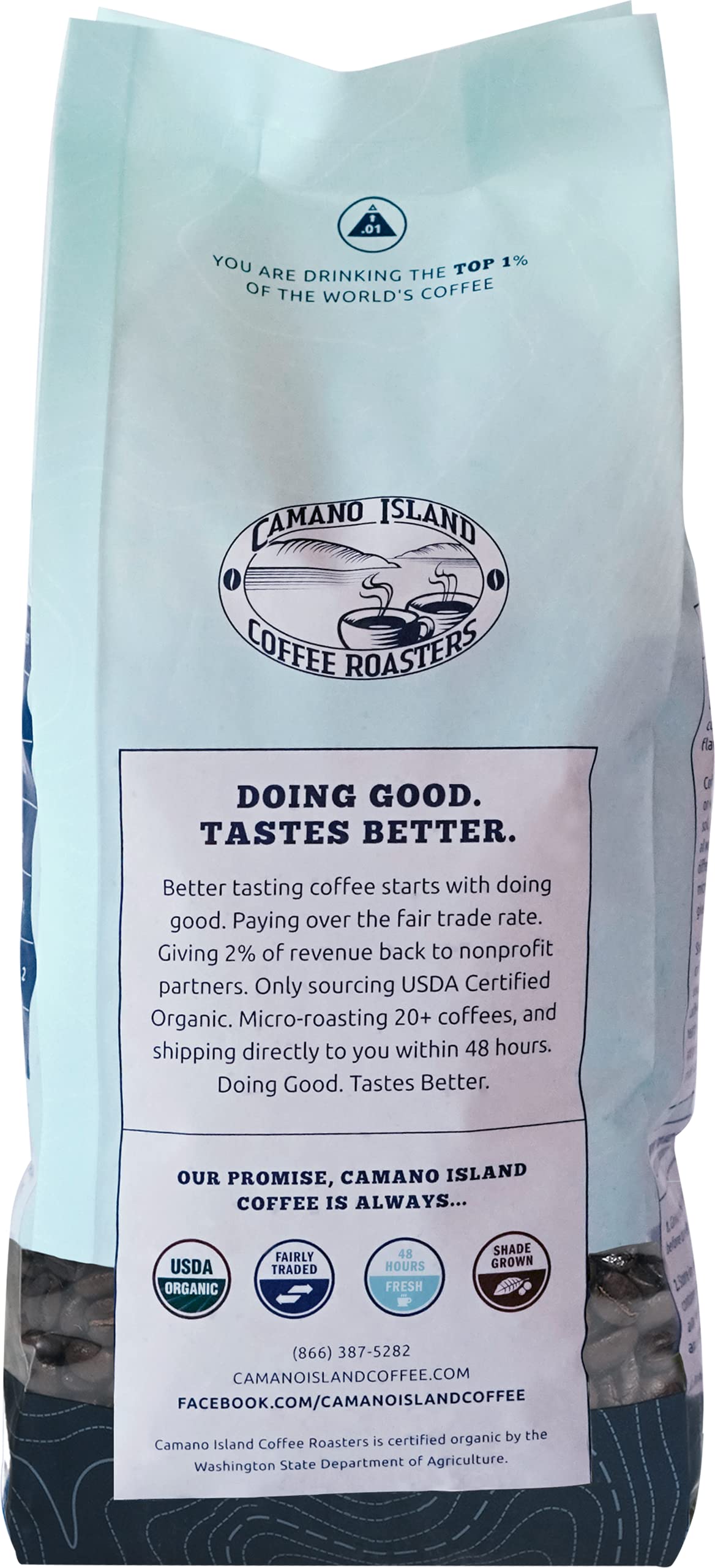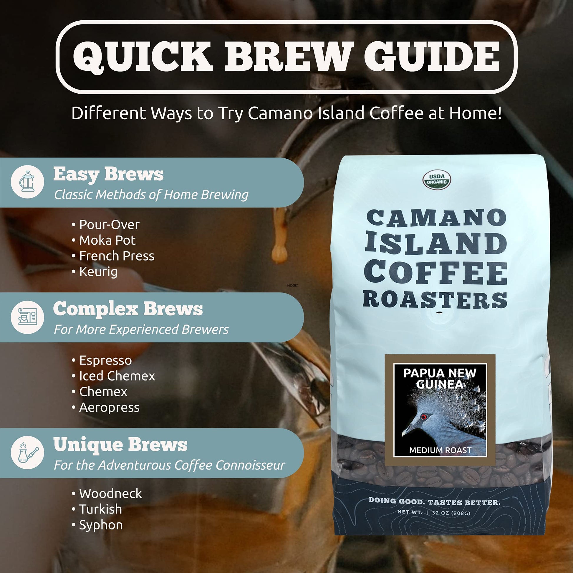 - Q: What makes Camano Island Coffee Roasters Papua New Guinea Whole Bean coffee unique? A: Camano Island Coffee Roasters Papua New Guinea Whole Bean coffee is unique due to its ethical sourcing, small-batch roasting, and high-quality beans that are USDA Organic, Fairly Traded, and Shade Grown. The coffee is made from Top 1% Arabica beans that provide a rich flavor profile with notes of cocoa, dried fruit, and brown sugar.