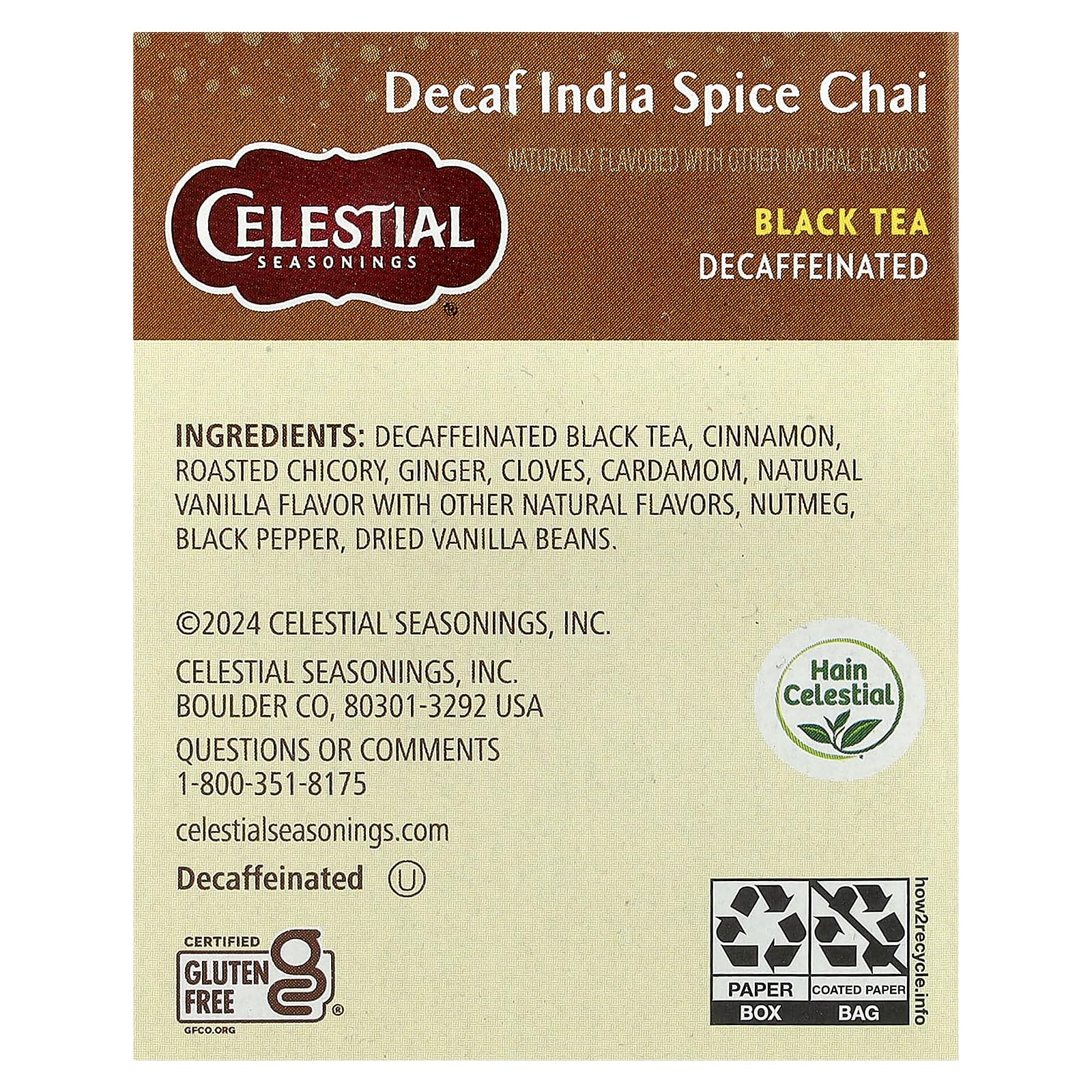 - Q: Does Celestial Seasonings Chai contain any allergens? A: Celestial Seasonings Original India Decaf Chai is free from common allergens like nuts and gluten. However, it is always recommended to check the packaging for any specific allergen information.