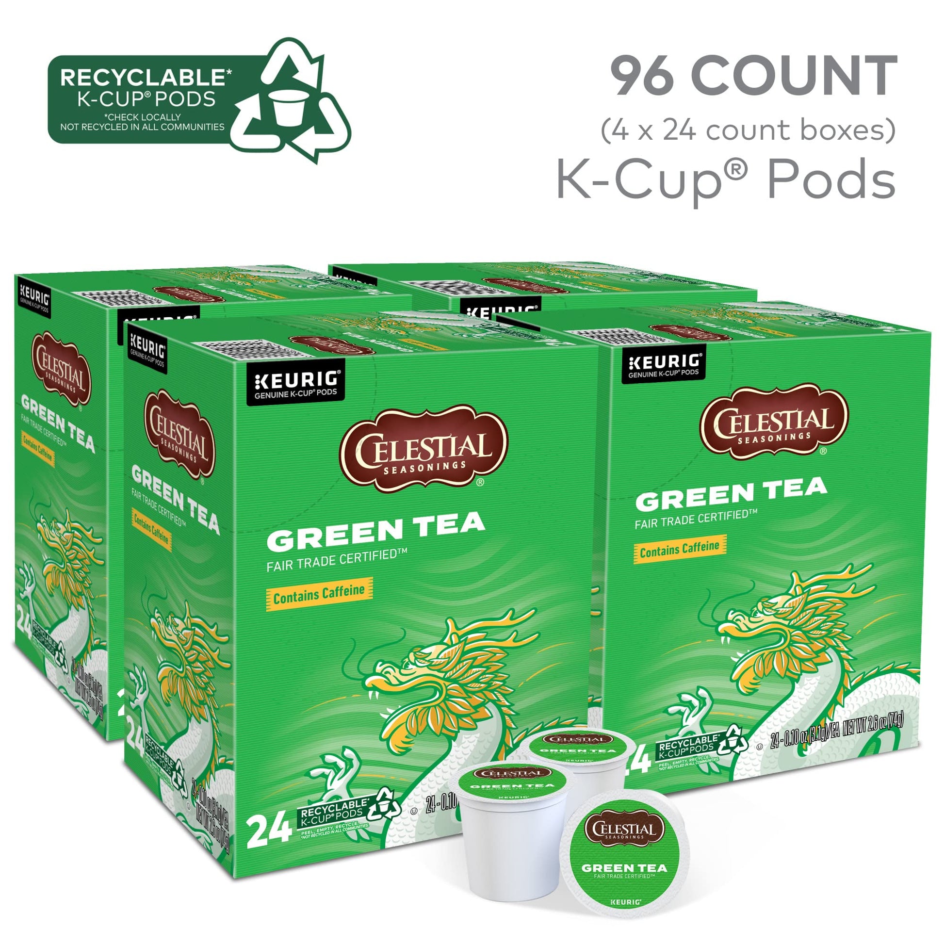 Q: What is the size of the package, and how many servings does it contain?A: The Celestial Seasonings Green Tea K-Cup Pods come in a pack of 24 pods, and this listing includes 4 packs for a total of 96 pods, ensuring you have plenty for multiple servings.