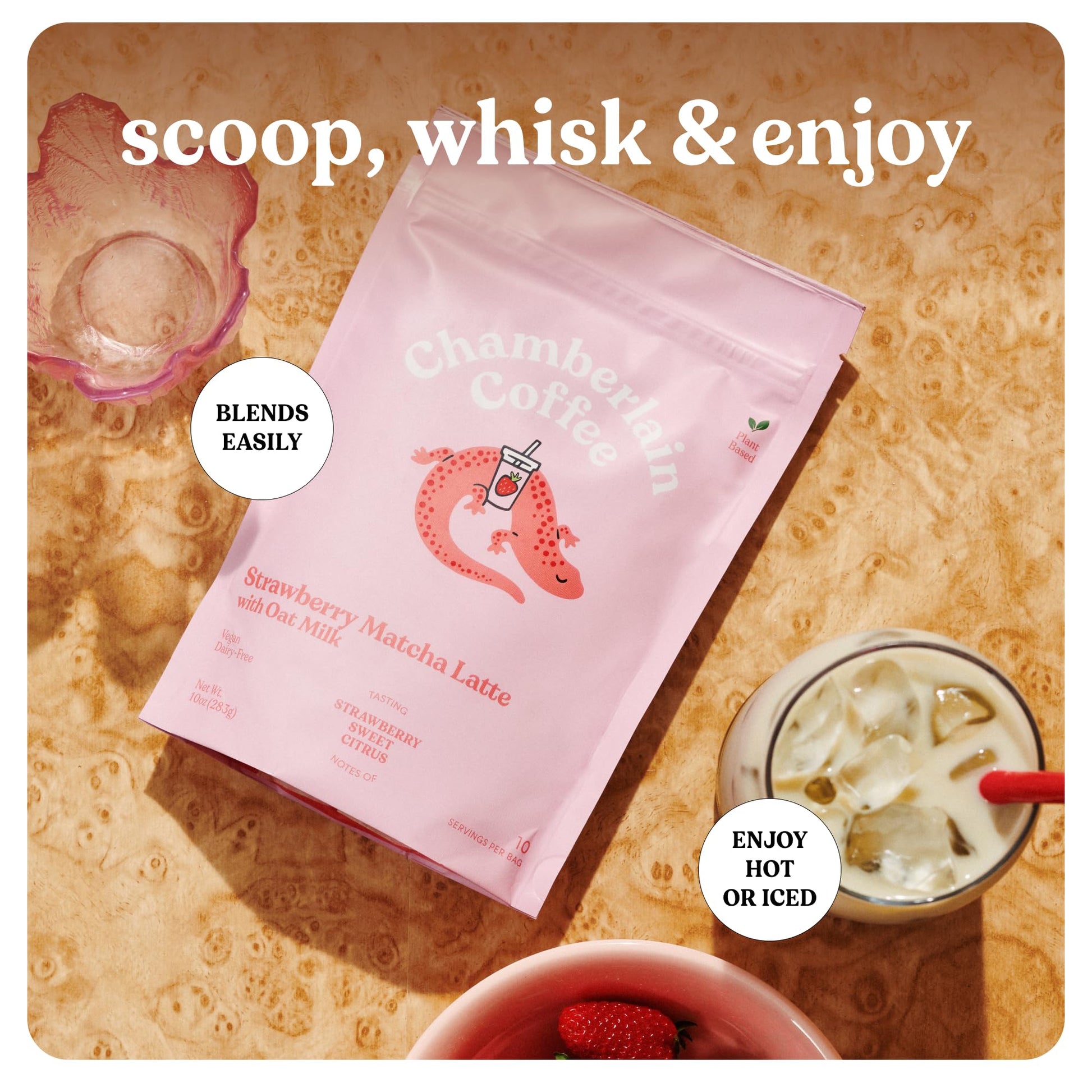 Q: Is the Strawberry Matcha Latte suitable for a vegan diet?A: Yes, the Chamberlain Coffee Strawberry Matcha Latte is entirely vegan, made with oat milk and free from any animal products, making it a perfect choice for those following a vegan lifestyle.