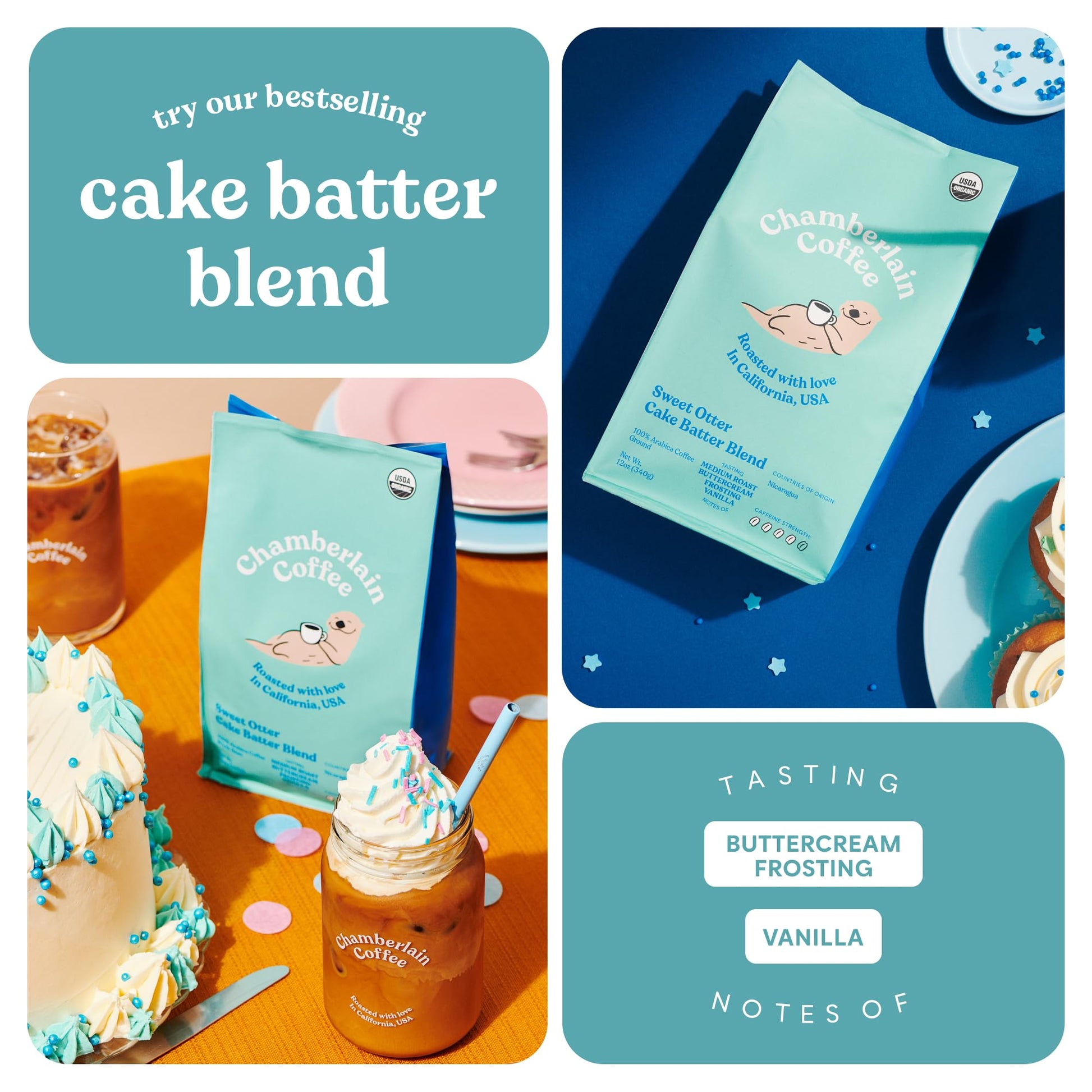 Q: What makes Chamberlain Coffee's Sweet Otter Cake Batter Blend unique?A: Chamberlain Coffee's Sweet Otter Cake Batter Blend stands out due to its medium roast profile that features delightful notes of birthday cake and vanilla buttercream frosting, creating a sweet and creamy coffee experience.