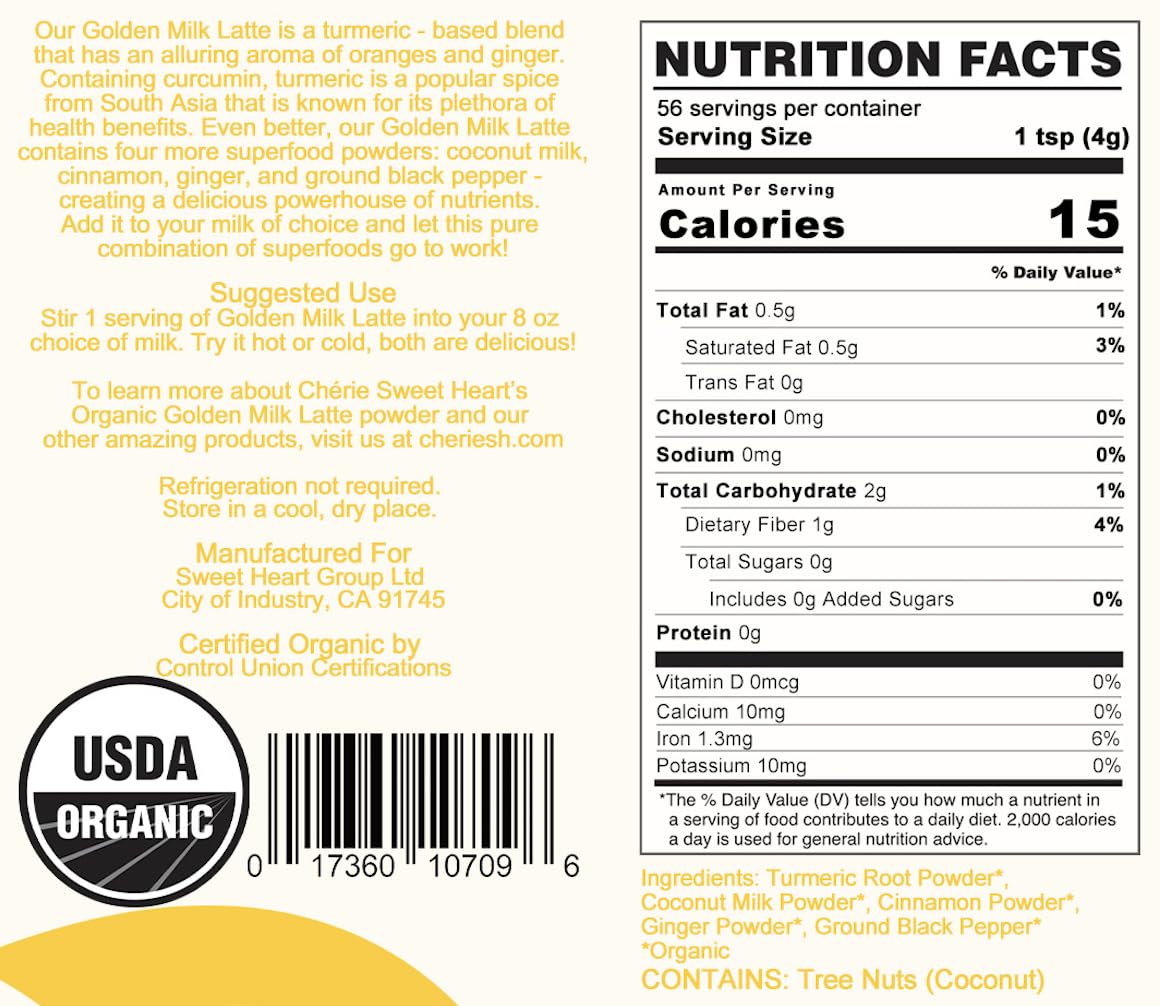 Our Golden Milk Latte Is A Turmeric-Based Blend That Has An Alluring Aroma Of Oranges And Ginger. Containing Curcumin, Turmeric Is A Popular Spice From South Asia That Is Known For Its Plethora Of Health Benefits. Even Better, Our Golden Milk Latte Contains Four More Superfood Powders: Coconut Milk, Cinnamon, Ginger, And Ground Black Pepper-Creating A Delicious Powerhouse Of Nutrients. Add It To Your Milk Of Choice And Let This Pure Combination Of Superfoods Go To Work! Style:Golden Milk Latte (8 Oz) Eating Green Isn'T A Trend, It'S A Lifestyle. And We Make It Affordable. Eating Towards A Healthier Future ''Ch Rie'' Is French For ''Sweet Heart''. We Emphasize Our Intent To Make The World, The People, And You To Be The Best That Can Be. We Believe That Eating Healthier Will Lead To Living Healthier, Cultivating A World Where Eating Greens Is Not Just A Trend, But Also A Lifestyle. Through Our Superfoods, We Believe That We Can Make The Future A Little Brighter And A Lot Healthier.