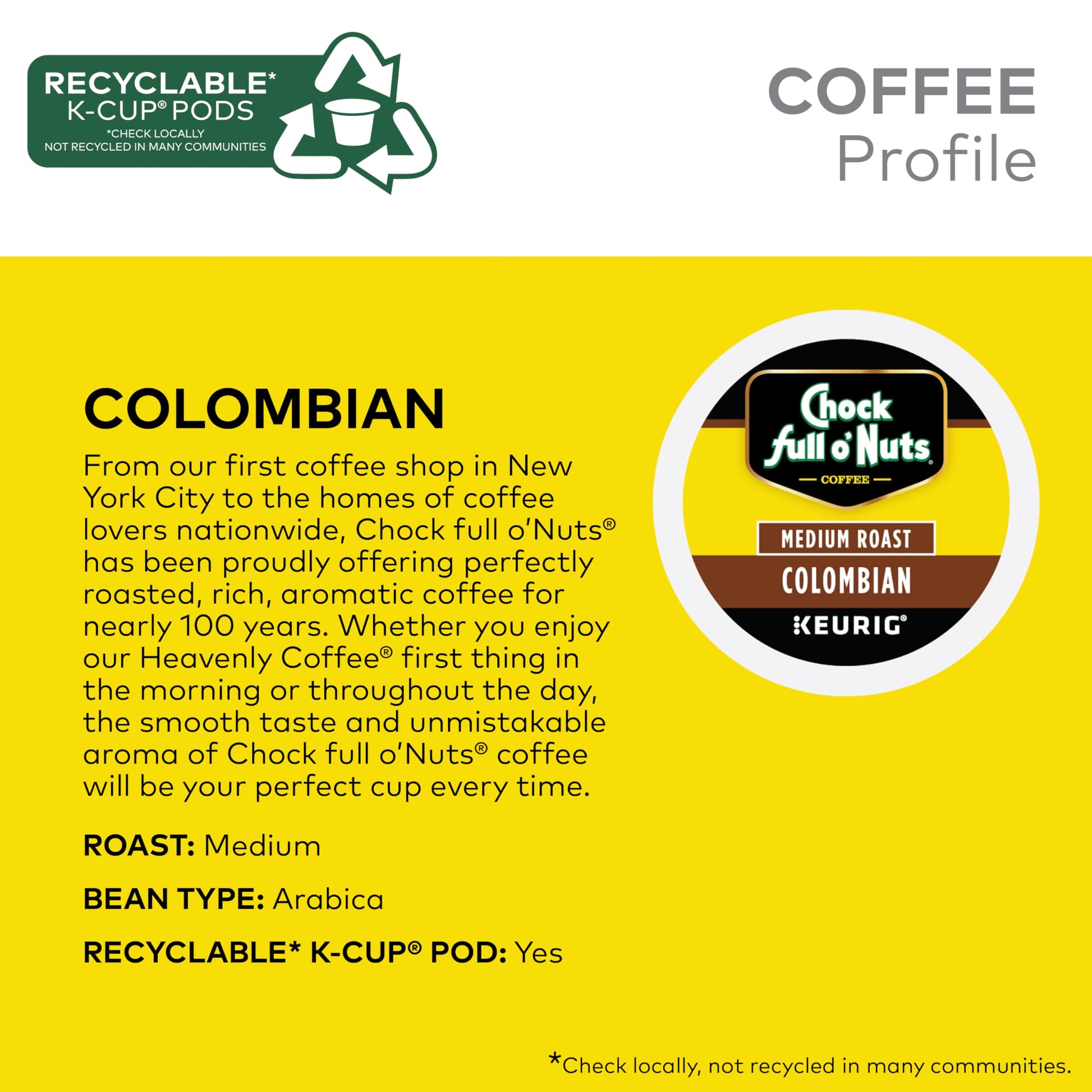 Since 1932, Coffee Lovers Have Been Starting Their Day With Chock Full Onuts. Our Colombian Medium Roast Single Serve Coffee Cups Deliver A Full, Satisfying Flavor With A Freshly Ground Aroma That Will Fill Your Home Or Office. Just Like The Classic Coffee You Remember, Colombian Medium Roast Has The Chock Full Onuts Signature Taste And Smoothness Without Any Bitterness Or Aftertaste. Our Colombian Medium Roast Is Made From Premium Arabica Coffee Beans That Are Hand-Selected From The Finest Growing Regions In Colombia. From Our First Coffee Shop On Broadway In New York City, Chock Full Onuts Has Been Roasting Perfectly Flavored, Aromatic Coffee For Nearly 100 Years. Now You Can Enjoy An Amazing Cup Of Coffee Day Or Night With Our Easy-To-Use, Single-Serve Pods. Chock Full O'Nuts K-Cup Pods Work With Any Keurig Coffee Maker For An Easy, Consistent Cup Every Time.
