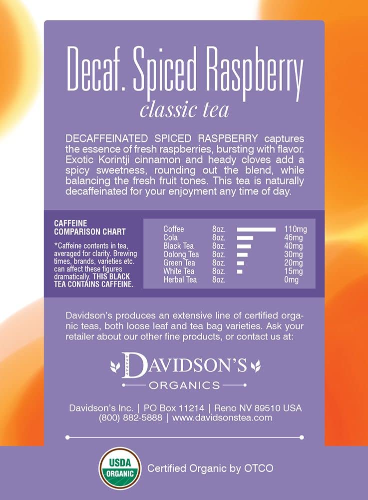 Decaffeinated Spiced Raspberry Combines The Essence Of Ripe Raspberries With Aromatic Spices And A Robust Base Of Decaffeinated Black Tea. Davidson'S Decaffeinated Spiced Raspberry Is A Full-Bodied, Cinnamon Raspberry Black Tea Brew, As Rich As Its Caffeinated Counterpart.