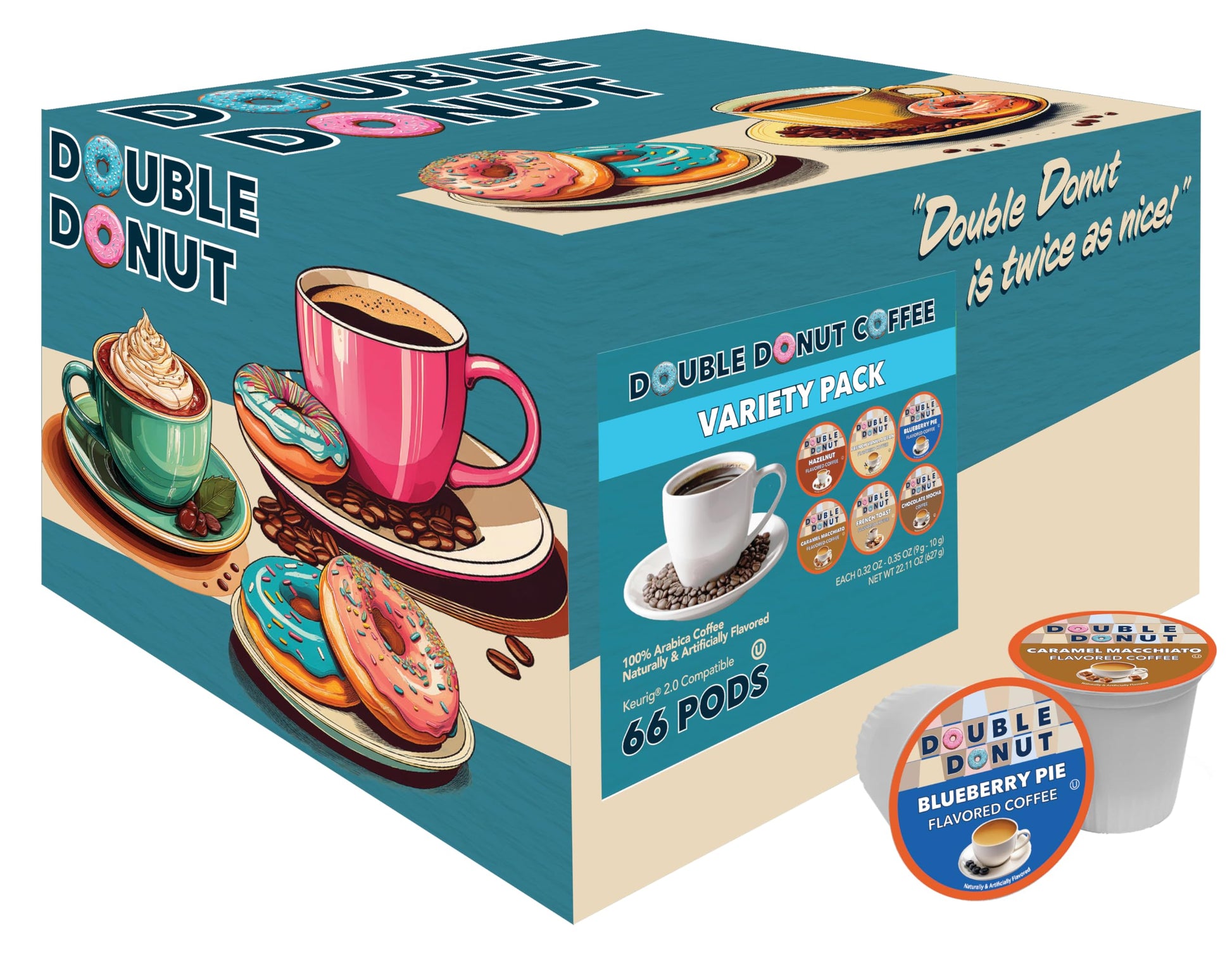 Q: How many coffee pods are in the Double Donut Coffee Variety Pack?A: The Double Donut Coffee Variety Pack contains a total of 66 single-serve coffee pods, providing plenty of options for coffee lovers to enjoy.