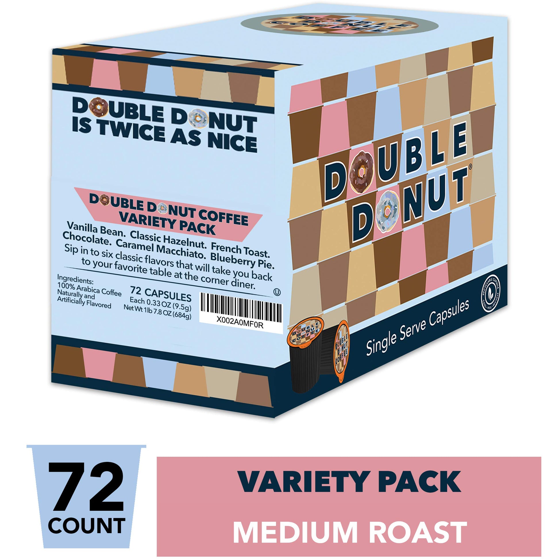 Q: What is the size of the Double Donut Flavored Coffee Variety Pack?A: The Double Donut Flavored Coffee Variety Pack contains 72 single-serve coffee pods, making it a perfect choice for households or offices that enjoy a variety of coffee flavors.