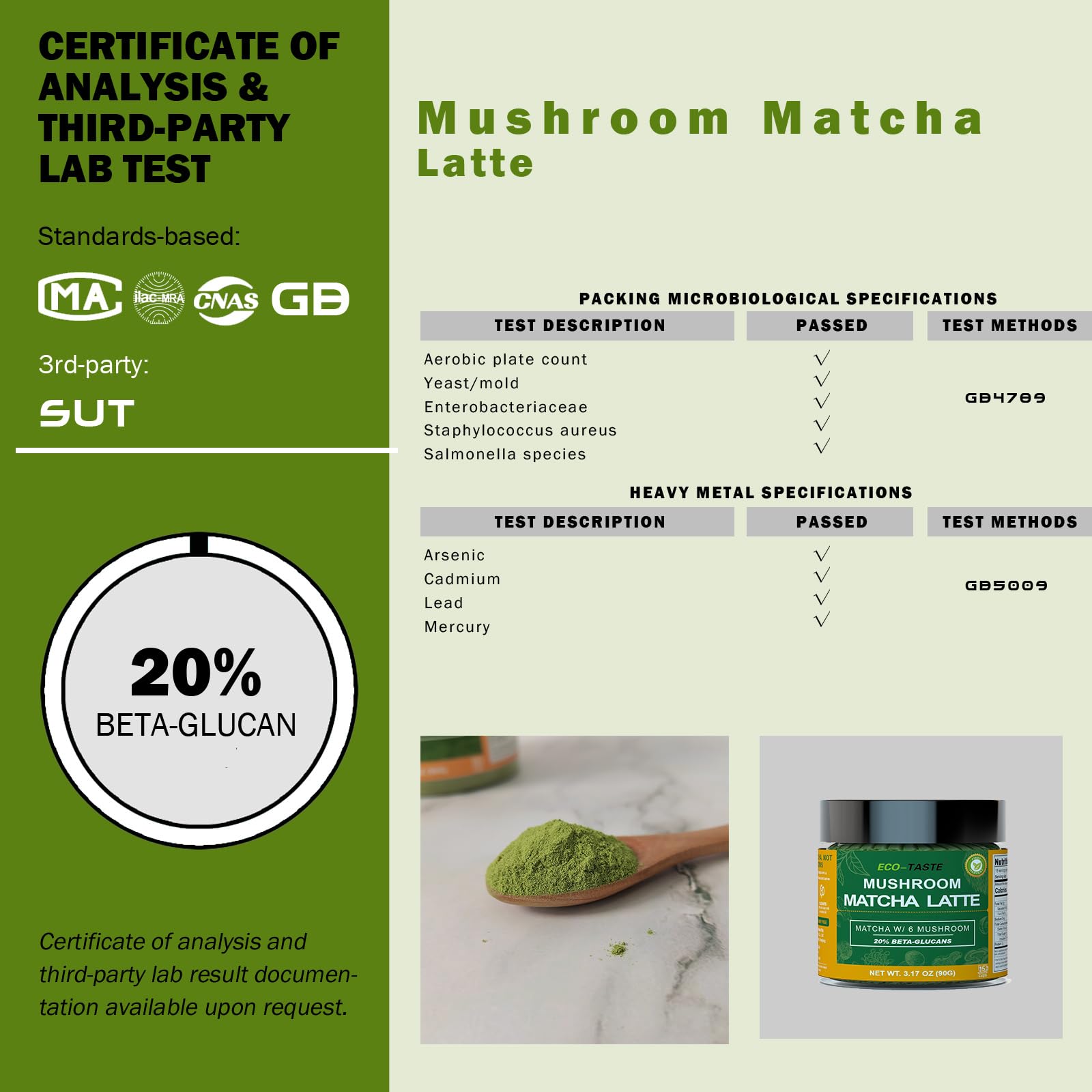 - Q: What types of mushrooms are included in the Mushroom Matcha blend? A: ECO-TASTE Mushroom Matcha features six mushroom extracts: Lion's Mane, Reishi, Turkey Tail, Maitake, Cordyceps, and Chaga. These mushrooms are known for their various health benefits, including cognitive support and immune enhancement.