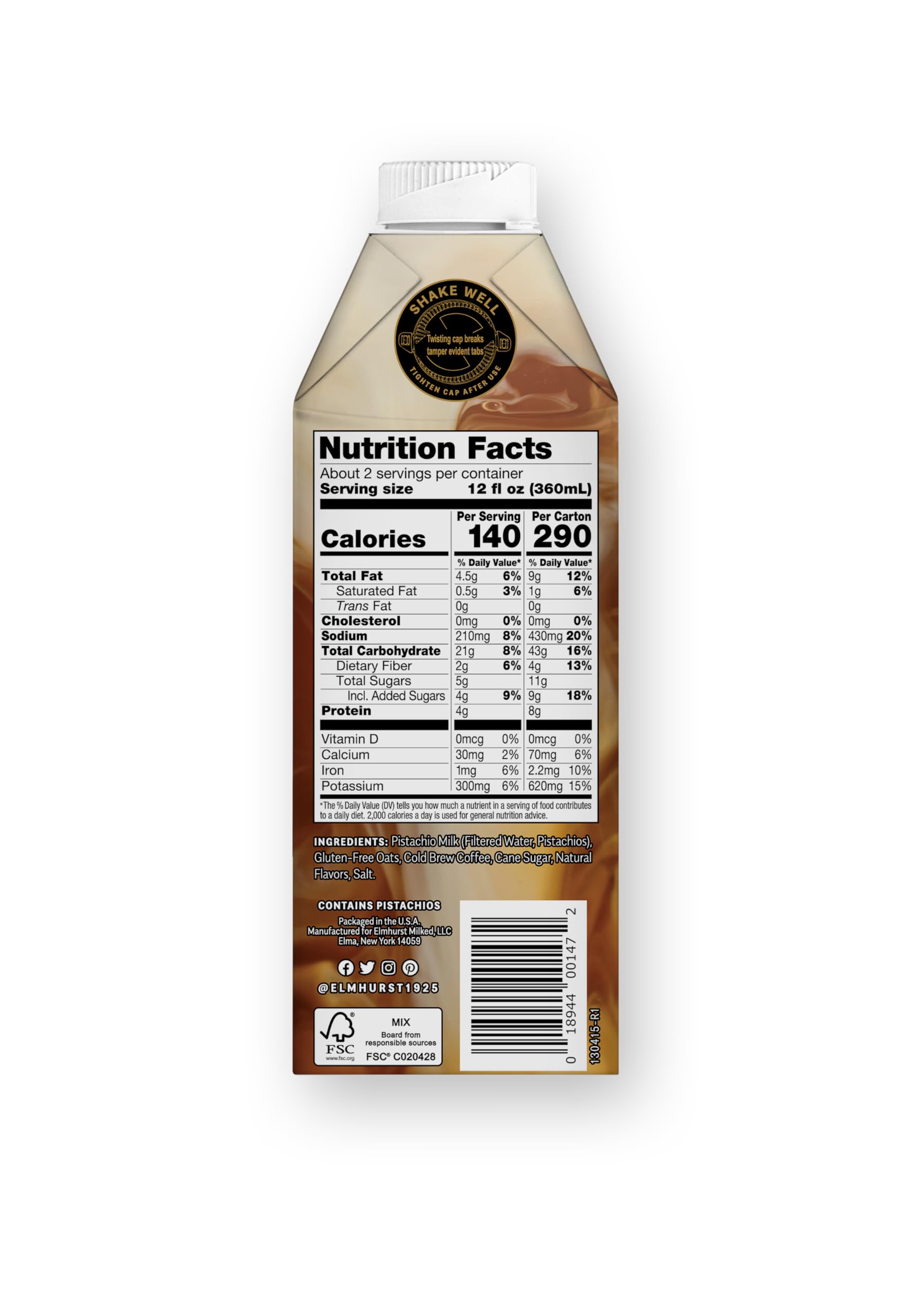 Q: What ingredients are in the Elmhurst 1925 Pistachio Crème Latte?A: The Elmhurst 1925 Pistachio Crème Latte is made with buttery pistachio milk, premium Arabica cold brew, and notes of sweet cream. It contains no gums, oils, or filler ingredients, making it a clean and simple option for your morning routine.
