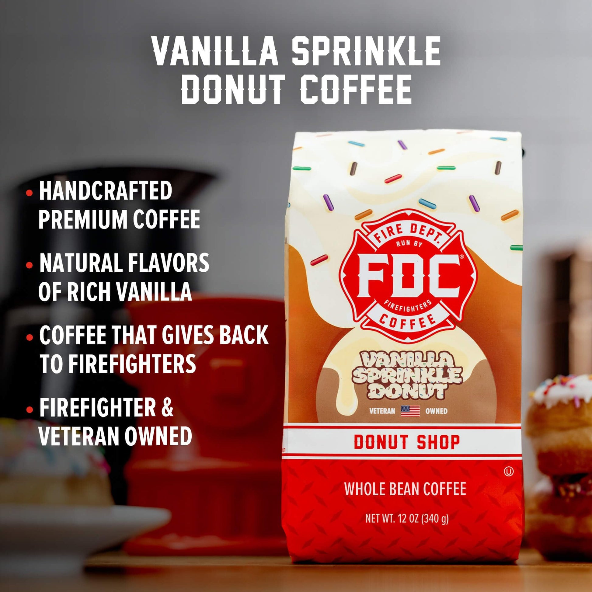 - Q: What makes Fire Department Coffee's Vanilla Sprinkle Donut Coffee unique? A: Fire Department Coffee's Vanilla Sprinkle Donut Coffee stands out due to its delightful blend of natural vanilla flavor and sugary goodness, creating a sweet and memorable medium roast experience. Each cup embodies the dedication and spirit of America's firefighters, making it not just a beverage but a tribute to their service.