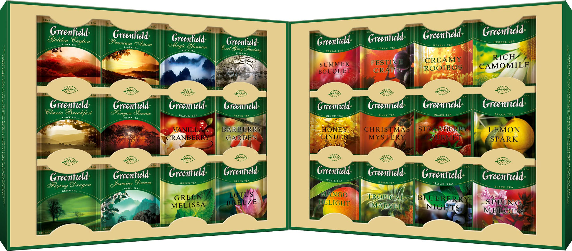 Q: What types of tea are included in the Greenfield Tea Collection?A: The Greenfield Tea Collection includes a variety of 24 unique teas, such as Greenfield Herbal Tea, Oolong Tea, Black Tea, Jasmine Tea, Earl Grey Tea, Golden Ceylon, English Breakfast, Peppermint, Raspberry, Cranberry, Blueberry, Ginger Tea, Chamomile Tea, Rooibos Tea, and many more.