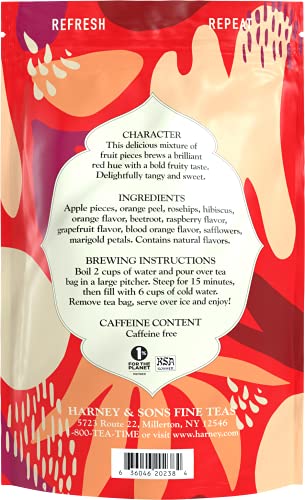 - Q: How do I brew Harney & Sons Blood Orange Iced Tea? A: To brew Harney & Sons Blood Orange Iced Tea, start by boiling 2 cups of water and pouring it over a tea bag in a large pitcher. Steep for 15 minutes, then fill the pitcher with 6 cups of cold water. Remove the tea bag and gently squeeze it to extract additional flavor. For the perfect touch, garnish with a slice of lemon, orange, or fresh mint.