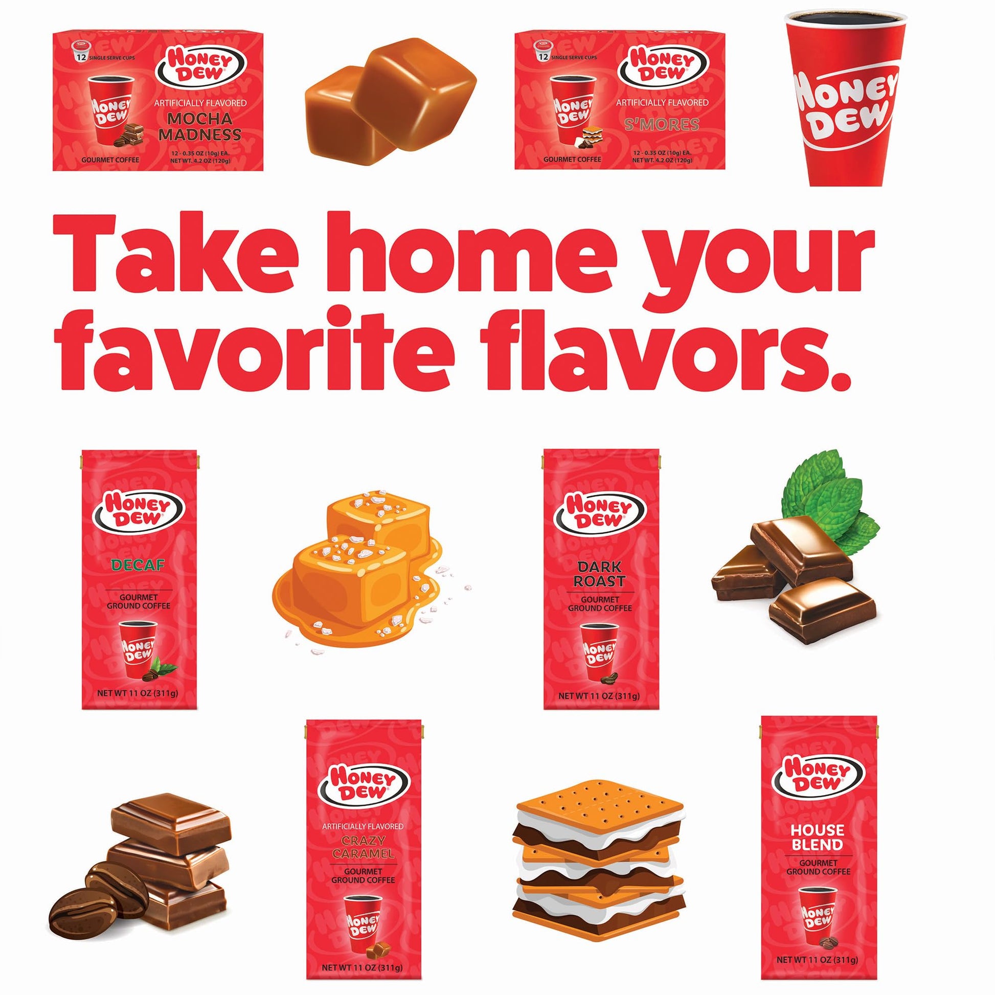 Q: What flavors are available in Honey Dew Decaf coffee?A: In addition to the classic decaf option, Honey Dew offers a variety of flavored coffees including Dark Roast, Crazy Caramel, Mocha Madness, Peppermint Mocha, S'mores, and Salted Caramel, ensuring there's a flavor to suit every taste.