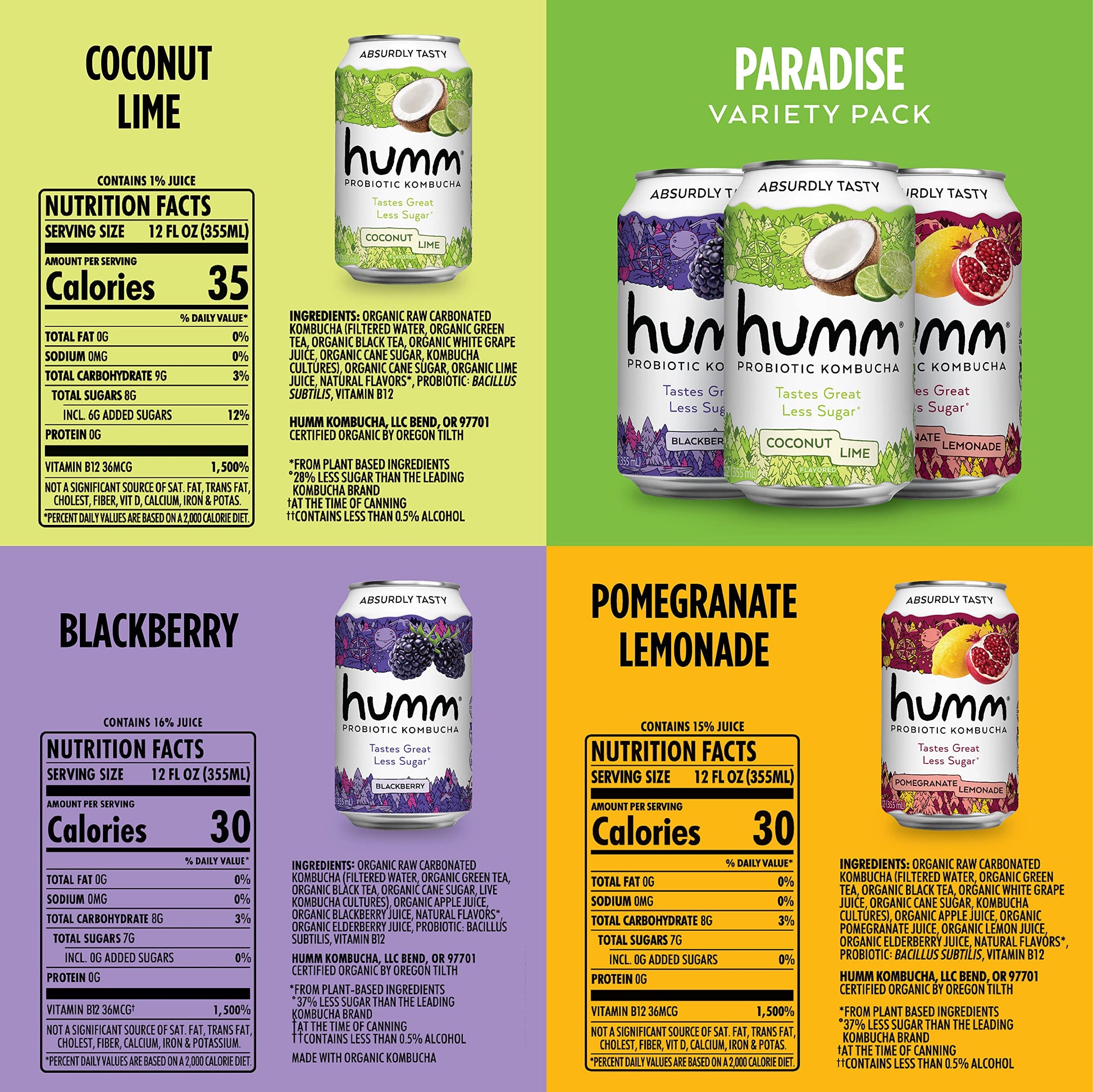 Delightfully Bubbly. Absurdly Tasty. Better For You. Choose A Better Beverage With The Humm Paradise Kombucha Variety Pack. Our Healthy Soda Variety Pack Contains 12 Kombucha Cans In The Following 3 Flavors (4 Cans Per Flavor) : Coconut Lime, Blackberry, And Pomegranate Lemonade. Our Healthy Drinks Are Made With Green And Black Tea That'S Fermented With Live Kombucha Cultures That Boost Your Microbiome For Better Gut Health. Each Delicious Serving Is Bursting With All Natural Flavor With : 40% Less Sugar Than Competing Kombucha Brands Zero Artificial Sweeteners, Flavors, Or Ingredients 1,500% Daily Value Vitamin B12 2 Billion Cfu Of Probiotics Wondering Why You Should Choose Humm Kombucha We Can Give You 2 Billion Good Reasons. Not All Kombucha Is Created Equal. We'Re Proud To Offer A Usda Certified Organic Kombucha Tea Blend That'S Gluten Free, Vegan, And Non Gmo. Best Of All, Each Serving Of Our Kombucha Bottles Offers All The Benefits Of Fermented Foods Plus 2 Billion Immune Boosting Probiotic Cultures. Refreshing. Energizing. The Perfect Healthy Soda That'S Lower In Sugar! Skip The Artificially Sweetened Zero Sugar Soda And Delight Your Taste Buds With A Kombucha Drink That'S As Delicious As It Is Healthy. Each Humm Probiotic Kombucha Can Is Sweetened With Natural Fruit Juice And Contains 8 Or Less Grams Of Sugar. But That'S Not All, Every Serving Delivers 1,500% Of The Daily Value Of Vitamin B12 To Boost Energy And Promote Overall Wellness. Perfect For Your On The Go Lifestyle... Humm Kombucha Tea Comes Conveniently Packaged In Single Serving Cans That Don'T Require Refrigeration. They'Re The Perfect Healthy Drinks To Keep On Hand For Mocktail Hour, Bbq'S, Sports Games, And After School. *Best Served Chilled Dry January Drinks Mocktails
