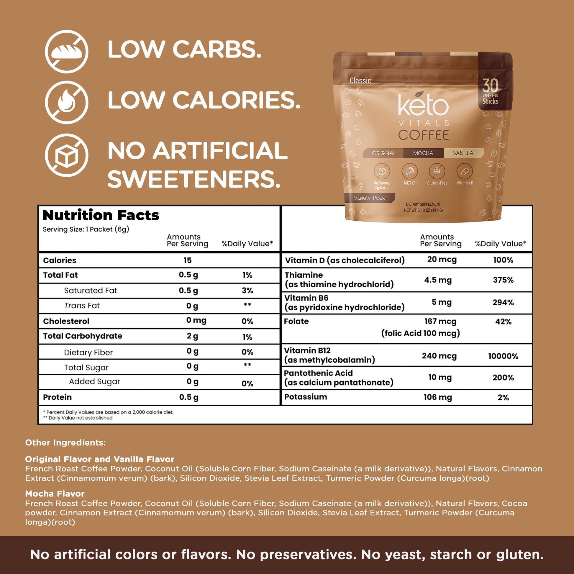 Jazz Up Your Morning Coffee With Ketovitals. Our Keto-Friendly Coffee Has Low Fat And Carb Content, So You Can Enjoy A Rich, Creamy Cup Of Joe Without Breaking Your Diet.Bursting With Benefitsthis Keto Coffee Instant Mix Thrills Your Taste Buds While Delivering These Healthful Benefits:Re-Energizes Your Bodyimproves Brain Functionimproves Gut Healthboosts Energysupports Heart Functionsuits Your Dietwhether You'Re On A Ketogenic, Atkins, Low Carb, Or Carnivorous Diet, Our Coffee Booster Keto Travel Packets Are For You! Each Serving Is Carefully Blended With Only Clean Ingredients - No Artificial Sweeteners, Colors, Yeast, Starch, Or Gluten.Rich In Vitamins And Mineralsvitamin D - Aids In Calcium Absorption, Bone Protection, And Optimal Muscle And Heart Function.Thiamine (B1) - Helps Your Cells Convert Food Into Energy.Folic Acid - Helps Produce Red Blood Cells To Carry Oxygen To The Body.Vitamin B6 - Helps Maintain The Normal Amount Of Homocysteine In Your Blood. Vitamin B12 - Plays An Essential Role In Red Blood Cell Formation And Cell Metabolism.Potassium - Helps Your Nerves To Function And Muscles Contract.Travel-Friendly Coffee Packetsour Instant Keto Coffee Is Packaged In 5-Gram Single Serving Coffee Packets, So You Can Easily Carry It Whenever And Wherever You Go.Treat Yourself To A Delicious Cup Of Ketovitals' Instant Keto Coffee Today!