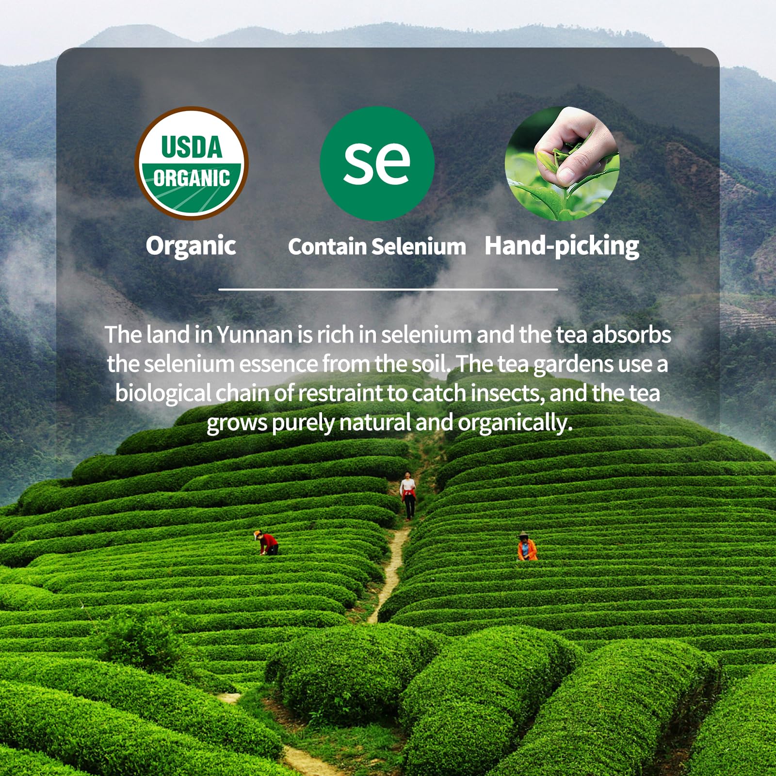- Q: What makes KHS Organic Raw Pu Erh Cake USDA Certified Organic? A: KHS Organic Raw Pu Erh Cake is USDA Certified Organic because it is made from tea leaves that are grown without the use of synthetic pesticides or fertilizers. This certification ensures that the tea is produced in an environmentally friendly manner, maintaining the purity and quality of the tea.