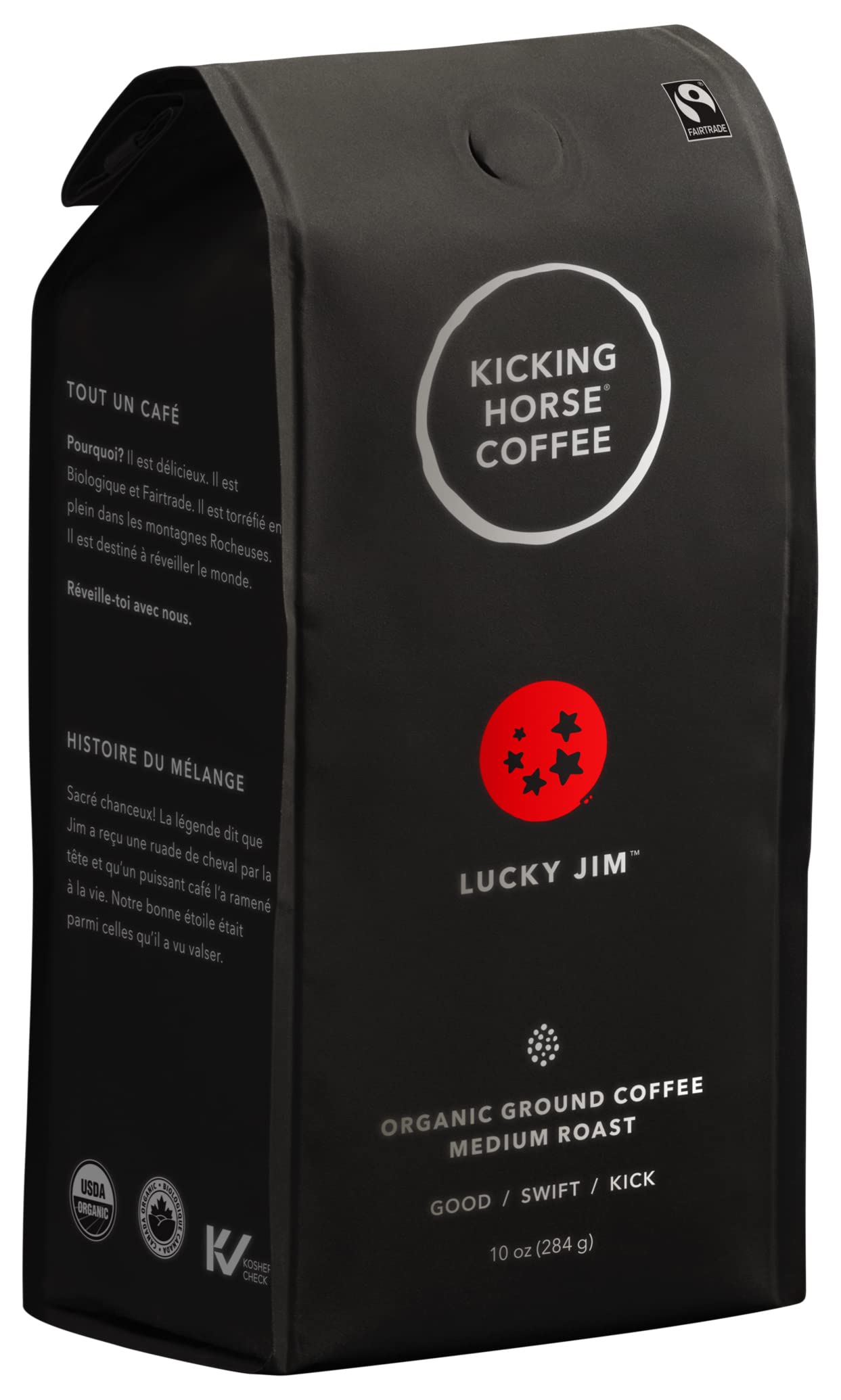 - Q: What makes Kicking Horse Coffee Lucky Jim different from other medium roast coffees? A: Kicking Horse Coffee Lucky Jim stands out due to its unique blend of flavors, including notes of chocolate, clove, grapefruit, and pine. Its medium-sweet body and long finish, combined with its organic, Fairtrade, and Kosher certifications, ensure a quality cup that's good for the planet and the farmers.