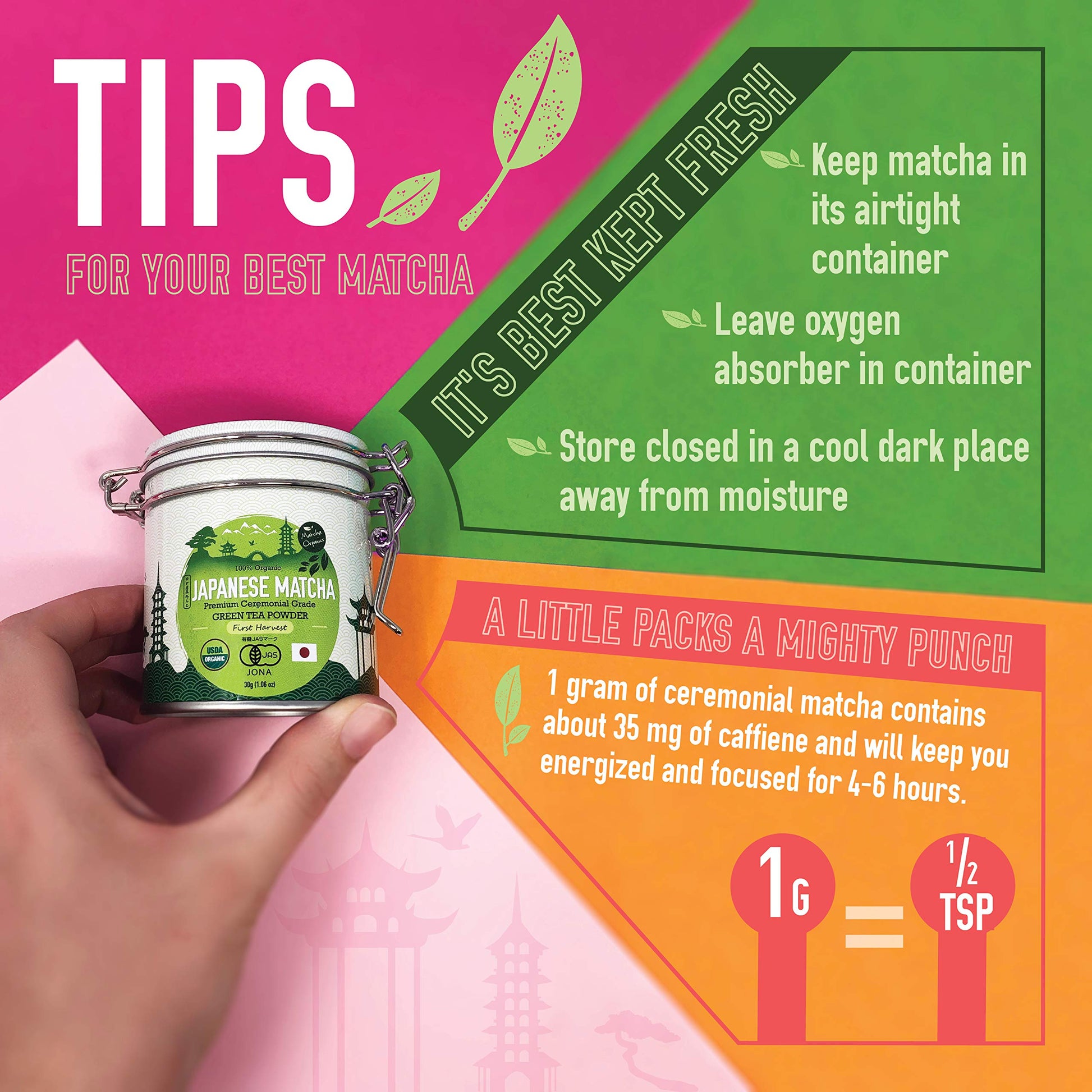- Q: How should I store matcha to maintain its freshness? A: To maintain the freshness of Matcha Organics' ceremonial grade matcha, store it in a cool, dry place in its airtight tin. Keep it away from light, moisture, and strong odors to preserve its vibrant color and flavor.