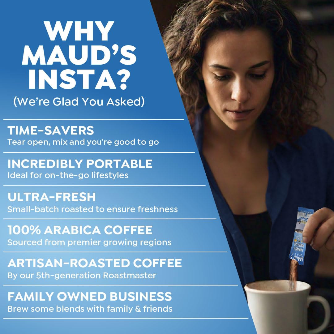 Q: What makes Maud's Instant French Vanilla Coffee different from regular instant coffee?A: Maud's Instant French Vanilla Coffee is crafted from 100% Arabica beans and features a unique medium roast blend with zero sugar sweetness and hints of vanilla and creme, providing a smooth-bodied coffee experience unlike traditional instant options.